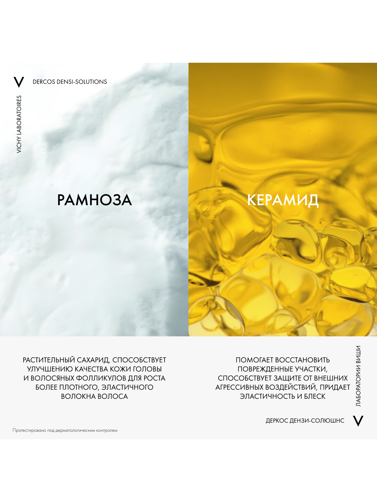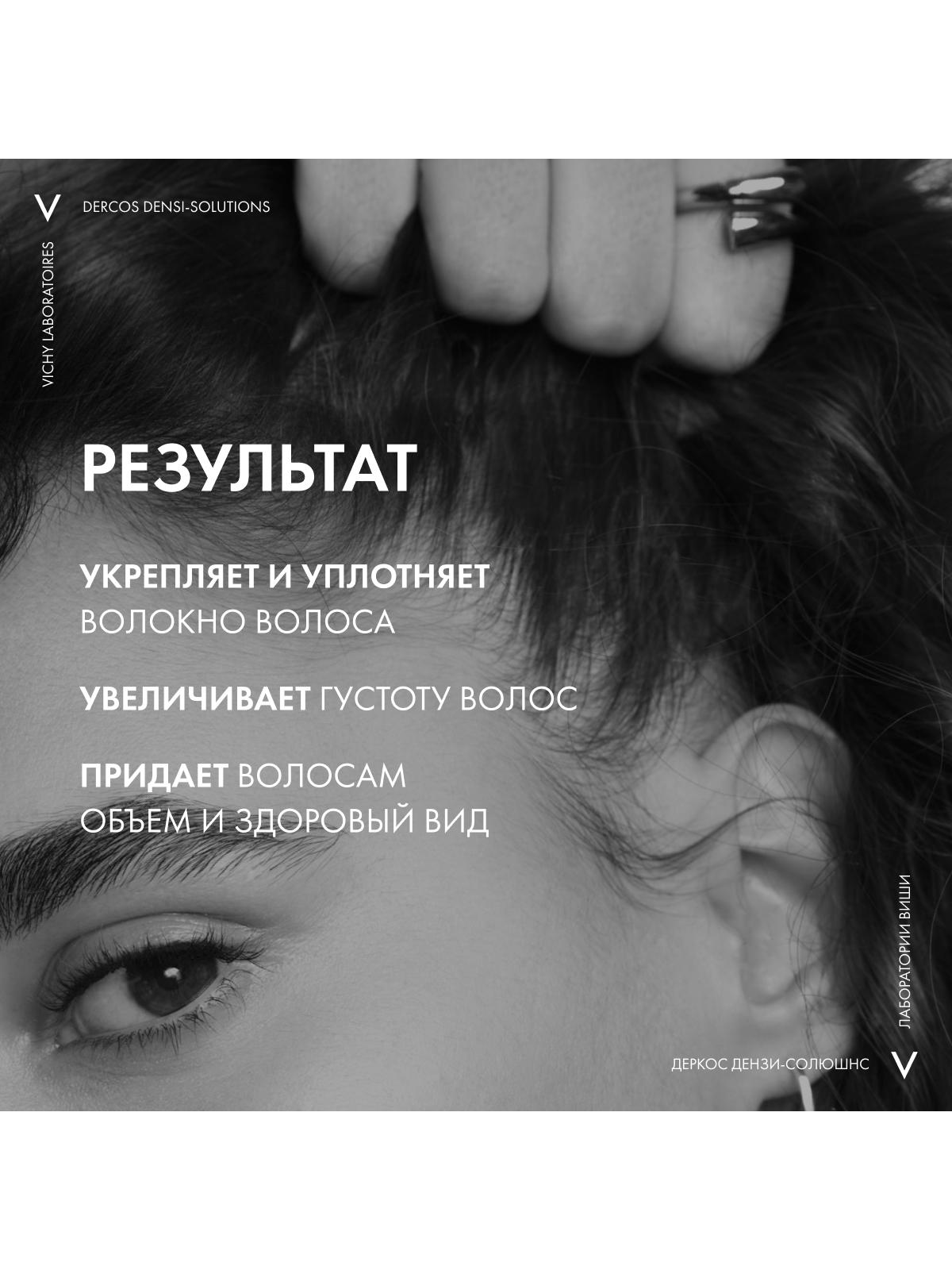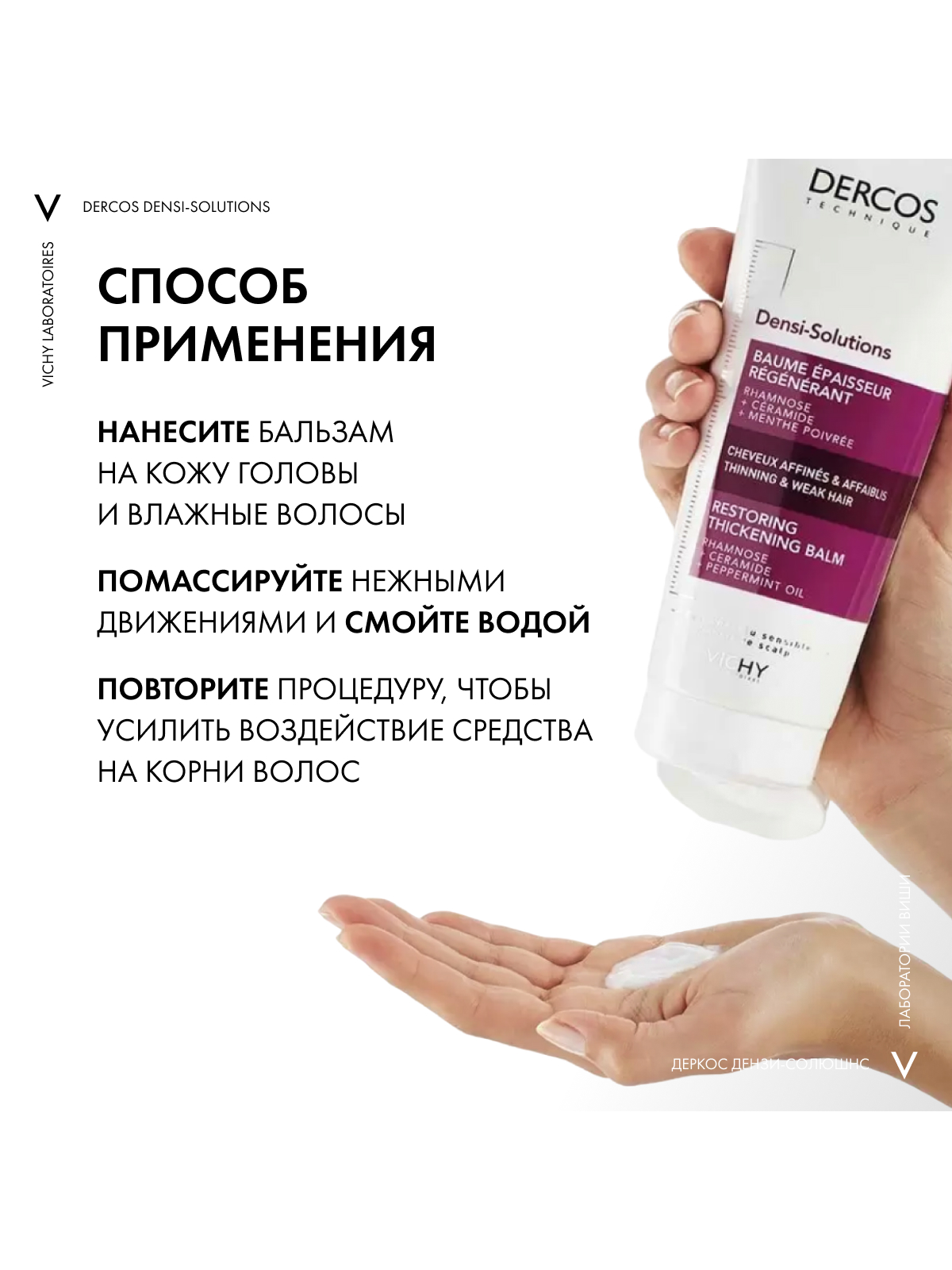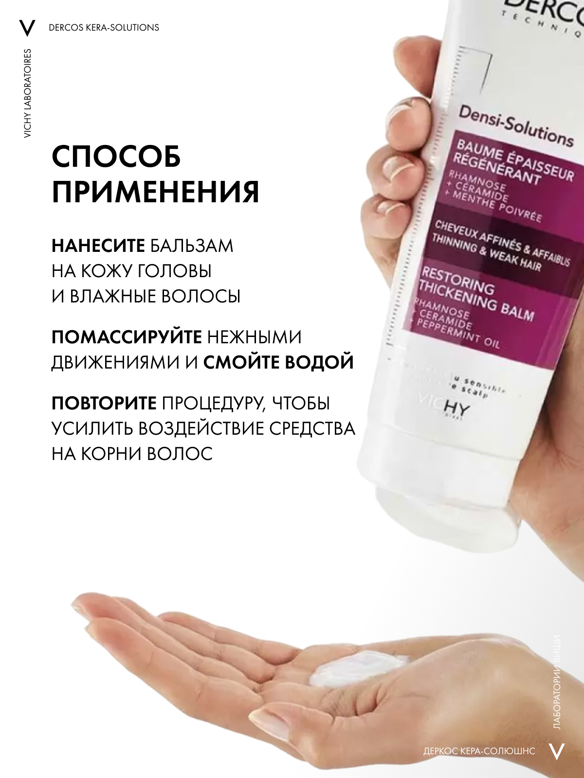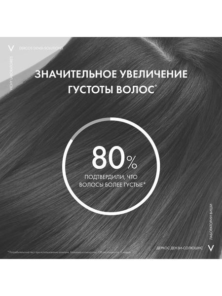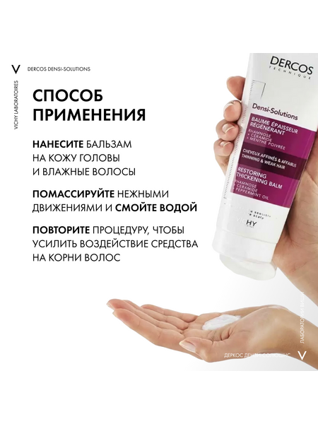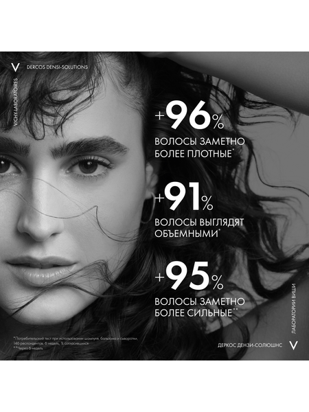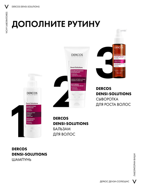Верните лучшее время Ваших волос с DERCOS DENSI-SOLUTIONS. Волосы более густые, плотные и крепкие¹." Эксперты Лабораторий VICHY разработали инновационную гамму средств по уходу за волосами, которая комплексно борется со всеми аспектами проблемы истончения волос. Сыворотка увеличивает количество волос, шампунь повышает плотность, а бальзам восстанавливает структуру волос.