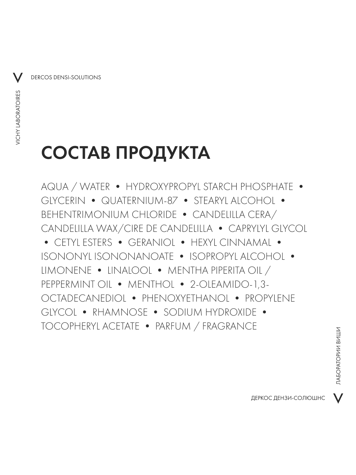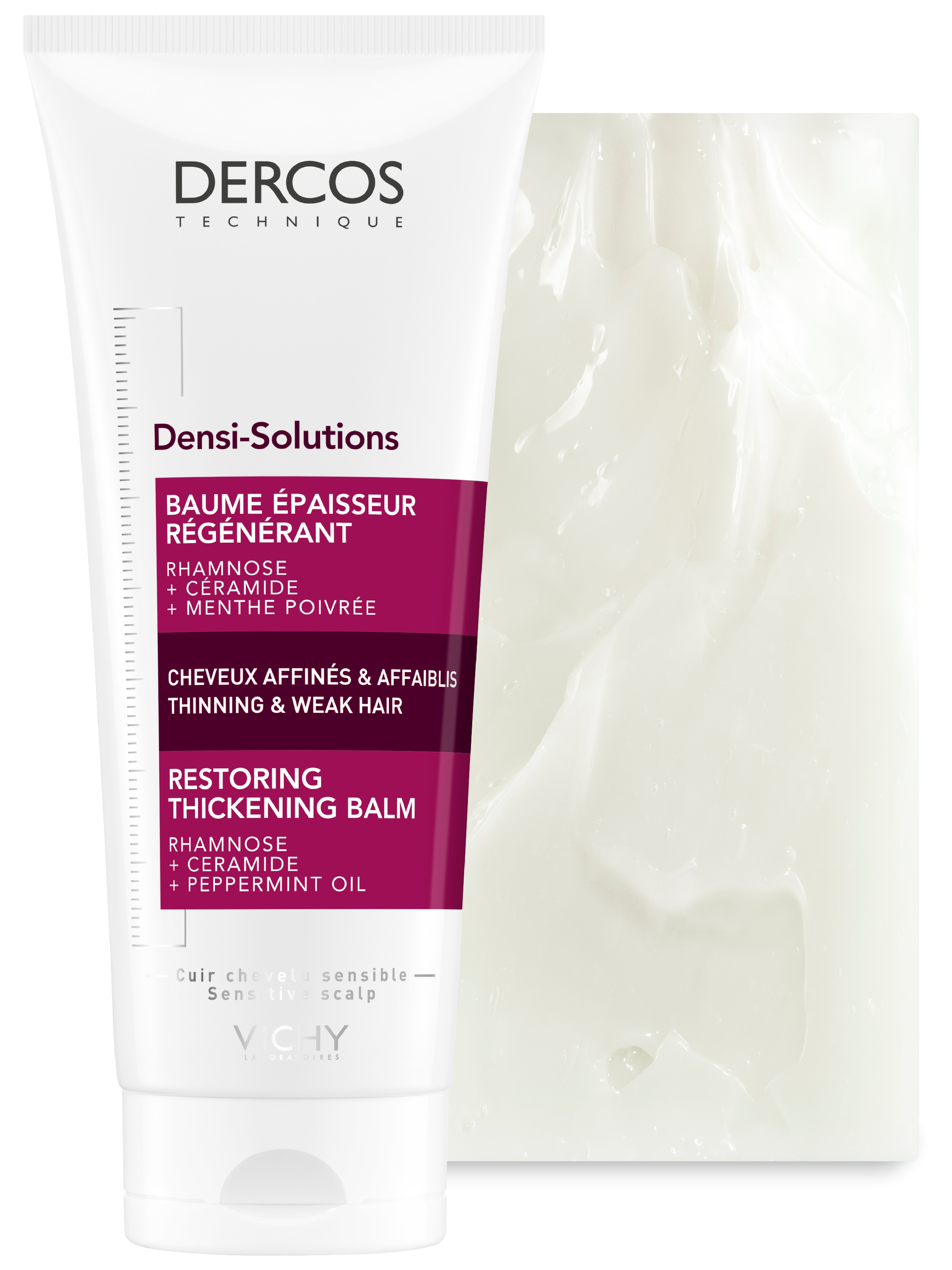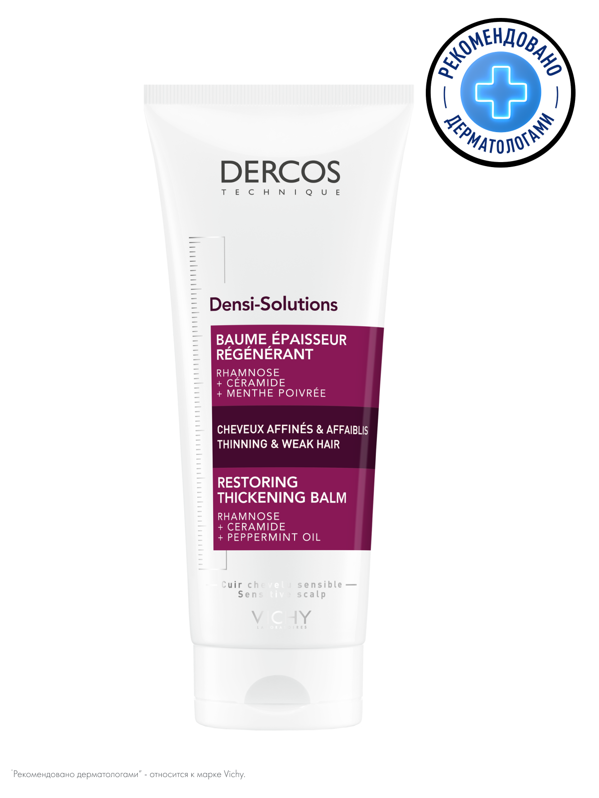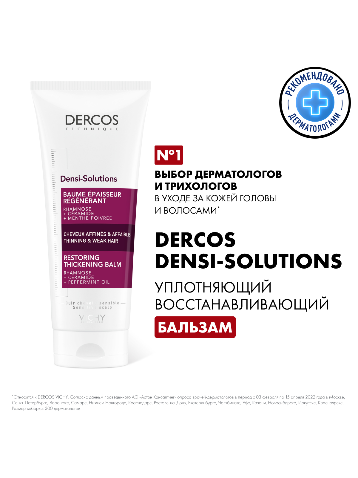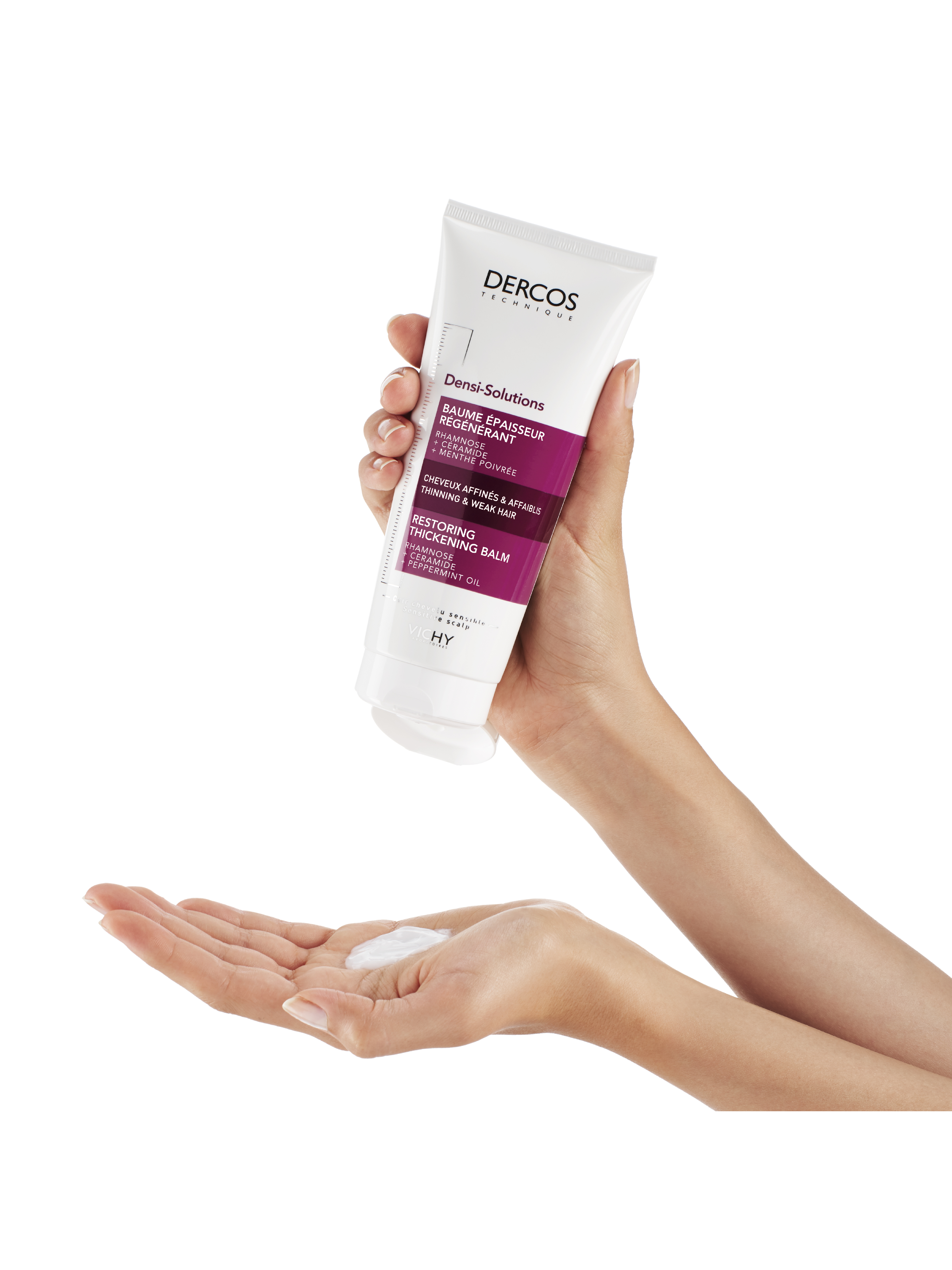 Верните лучшее время Ваших волос с DERCOS DENSI-SOLUTIONS. Волосы более густые, плотные и крепкие¹." Эксперты Лабораторий VICHY разработали инновационную гамму средств по уходу за волосами, которая комплексно борется со всеми аспектами проблемы истончения волос. Сыворотка увеличивает количество волос, шампунь повышает плотность, а бальзам восстанавливает структуру волос.