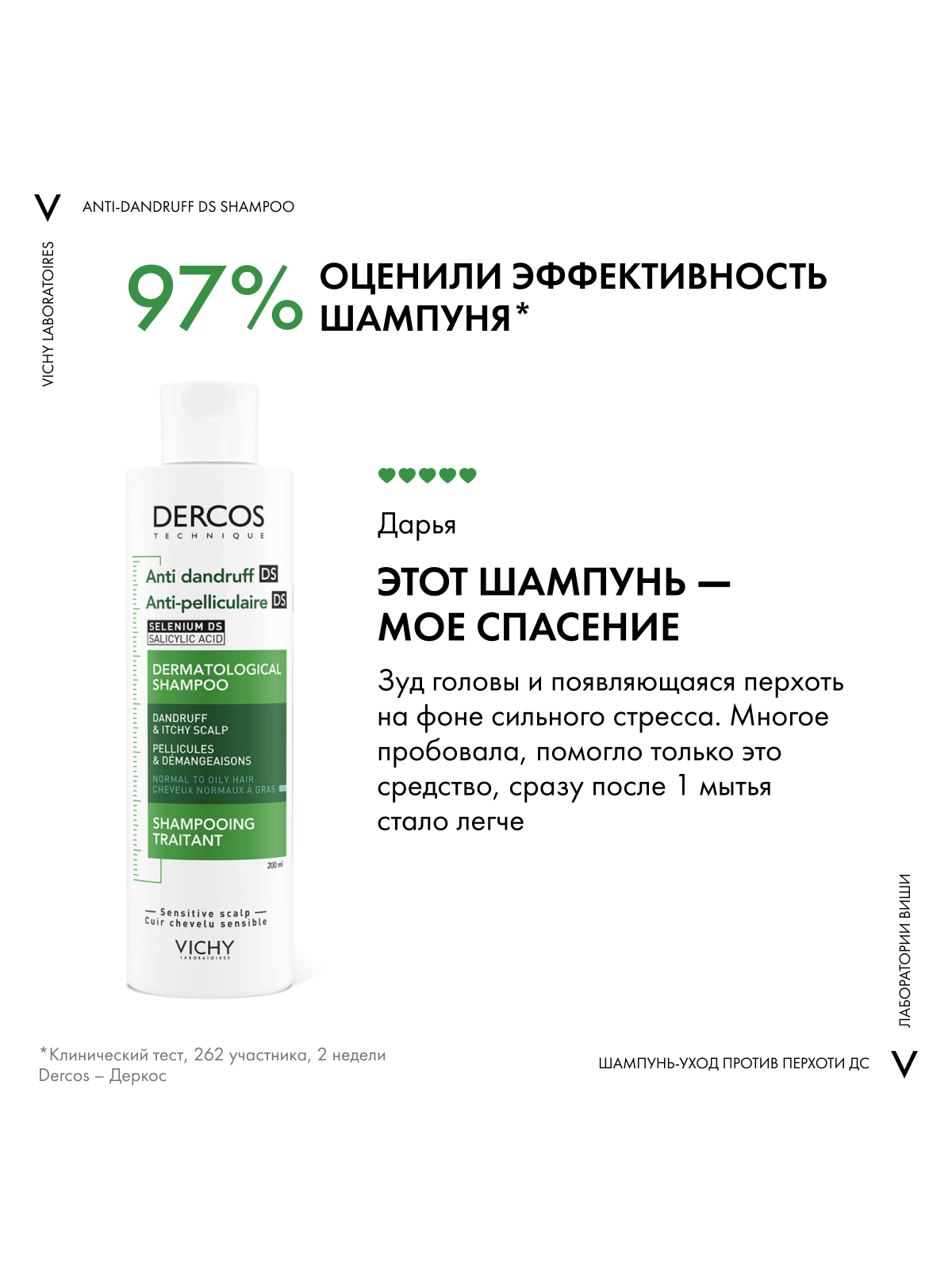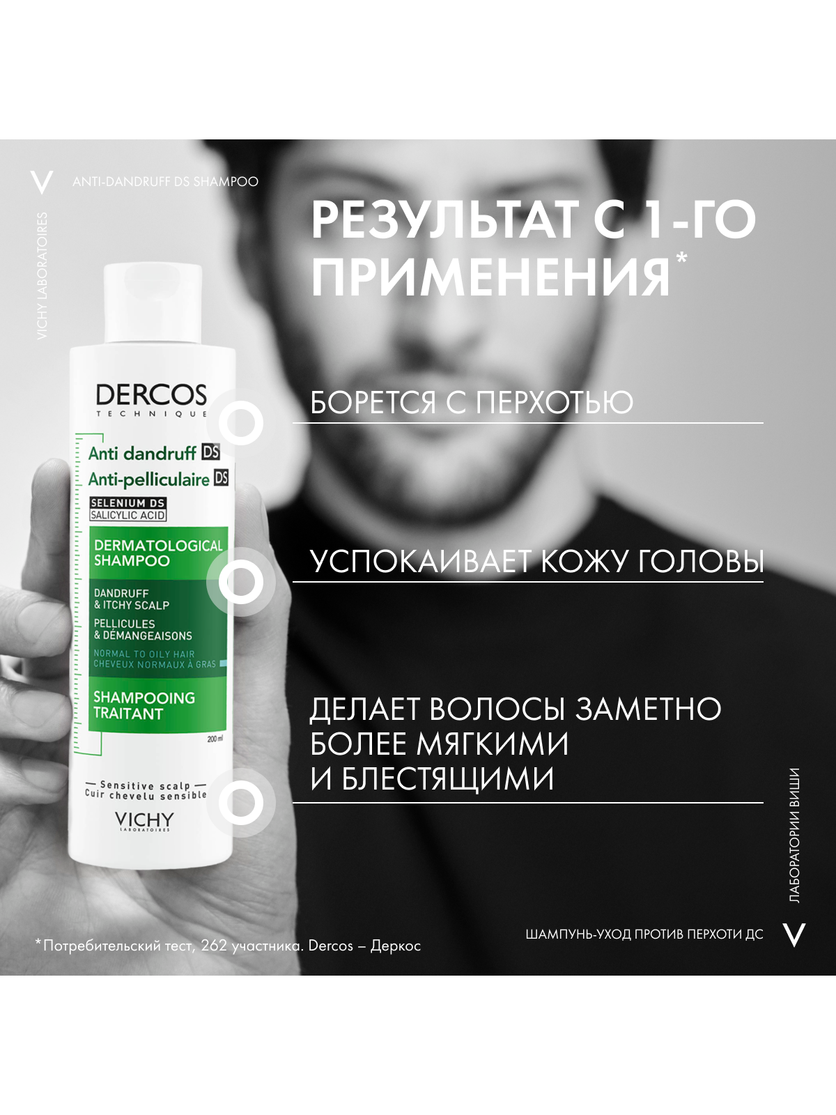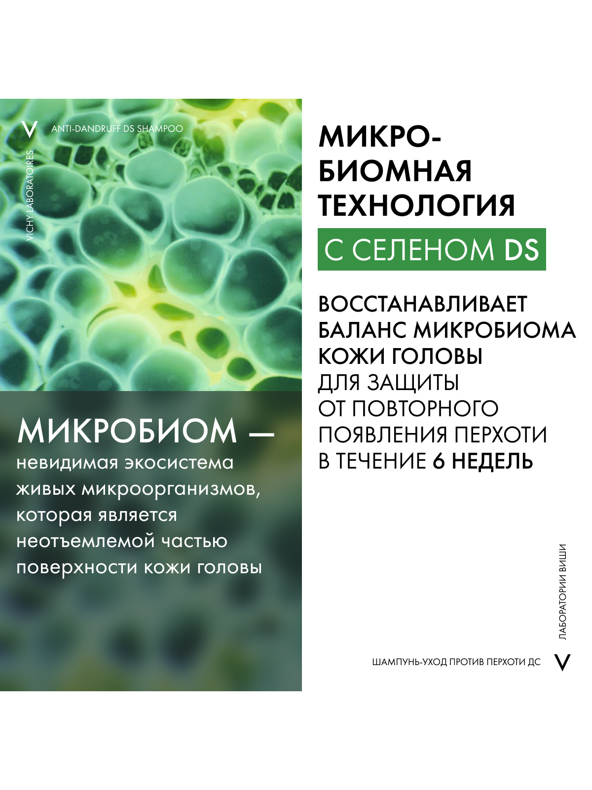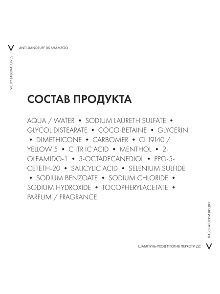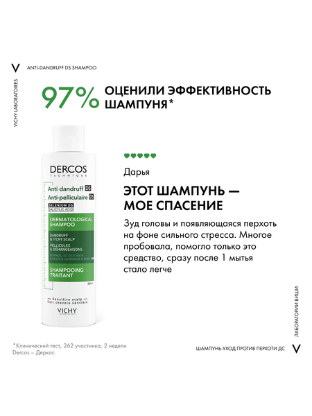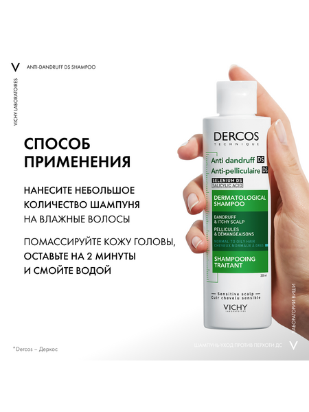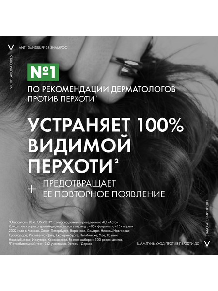 ВЫСОКАЯ ЭФФЕКТИВНОСТЬ клинически доказана Даже для раздраженной кожи головы. Протестировано на потребителях, страдающих от стресса и усталости, проживающих в условиях большого города. НОВЫЙ НАУЧНЫЙ ПОДХОД Впервые Лаборатории VICHY выявили дисбаланс в микробиоме кожи головы (совокупность микроорганизмов, в норме присутствующих на коже), который характерен для перхоти. ЭКСПЕРТИЗА Технология с Селеном DS* с доказанной эффективностью в восстановлении микробиомного баланса. Результат: Устраняет видимую перхоть уже после первого применения и успокаивает кожу головы. Предотвращает повторное появление перхоти в течение 6 недель**. Протестировано под контролем дерматологов.