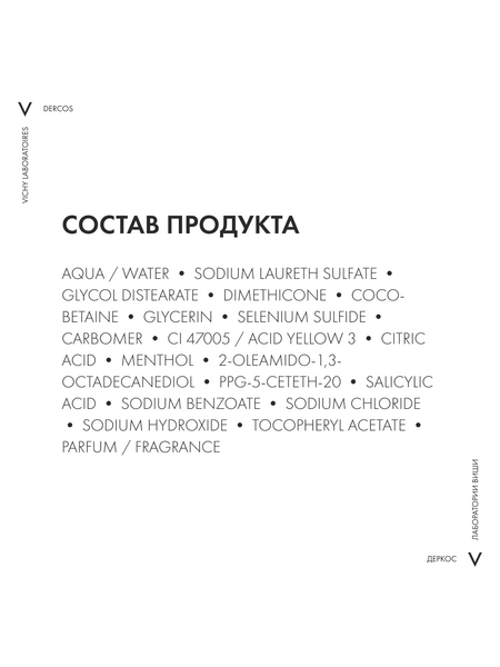 AQUA /WATER, SODIUM LAURETH SULFATE, GLYCOL DISTEARATE,DIMETHICONE, COCO-BETAINE, GLYCERIN, CARBOMER,CI 19140/YELLOW 5, CITRIC ACID, MENTHOL,2-OLEAMIDO-1,3-OCTADECANEDIOL, PPG-5-CETETH-20,SALICYLIC ACID, SELENIUM SULFIDE, SODIUM BENZOATE,SODIUM CHLORIDE, SODIUM HYDROXIDE, TOCOPHERYLACETATE, PARFUM/FRAGRANCE