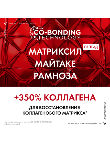 Инновационная технология Co-Bonding* (Рамноза – Матриксил – Экстракт Майтаке) с про-коллаген пептидами стимулирует и укрепляет различные типы коллагена кожи: +350% коллагена.**