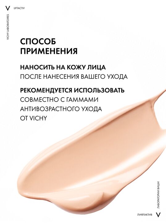 Наносить на очищенную кожу лица после нанесения Вашего ухода. Рекомендуется использовать совместно с гаммами антивозрастного ухода от VICHY.