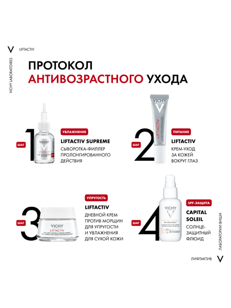 БрендVichy Возрастные ограничения30+ ГаммаLIFTACTIV НазначениеЛифтинг, Морщины, Потеря упругости и эластичности, Тусклый цвет кожи, потеря сияния Область примененияЛицо Состояние кожиВозрастные изменения Тип продуктаКрем ПотребностьАнтивозрастной уход, Ежедневное применение