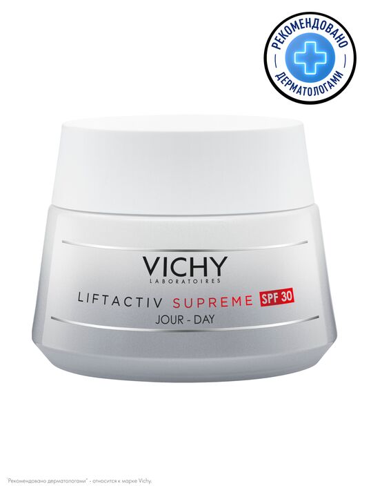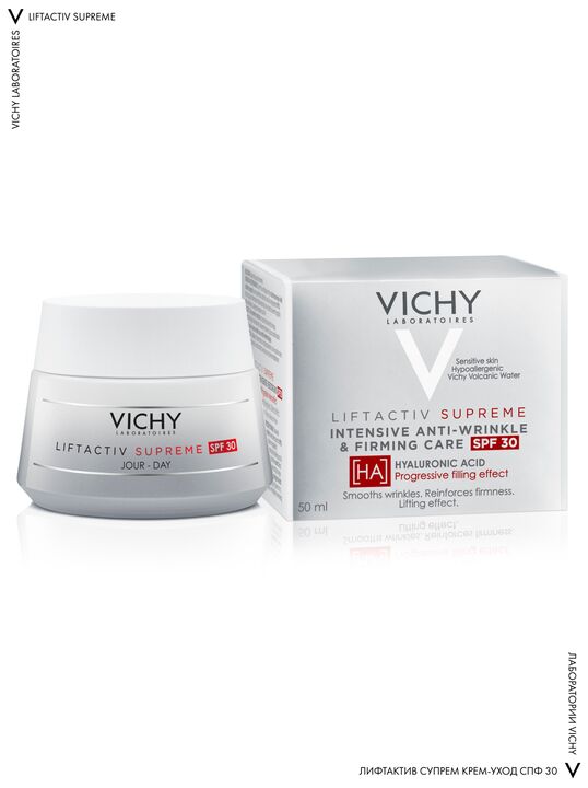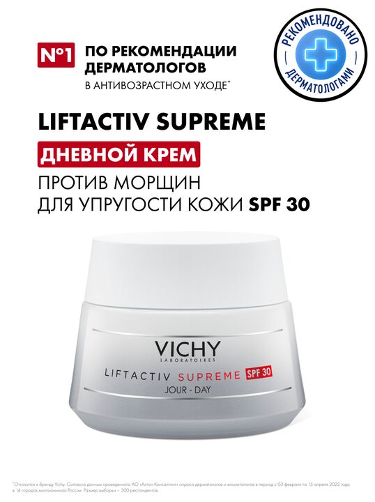 1-ый антивозрастной крем-уход* Liftactiv Supreme с защитой от солнца SPF 30 / PPD 17,5 и мощными антивозрастными ингредиентами, защищает от фотостарения и предотвращает формирование новых возрастных изменений, вызванных негативным воздействием UVA/UVB лучей.