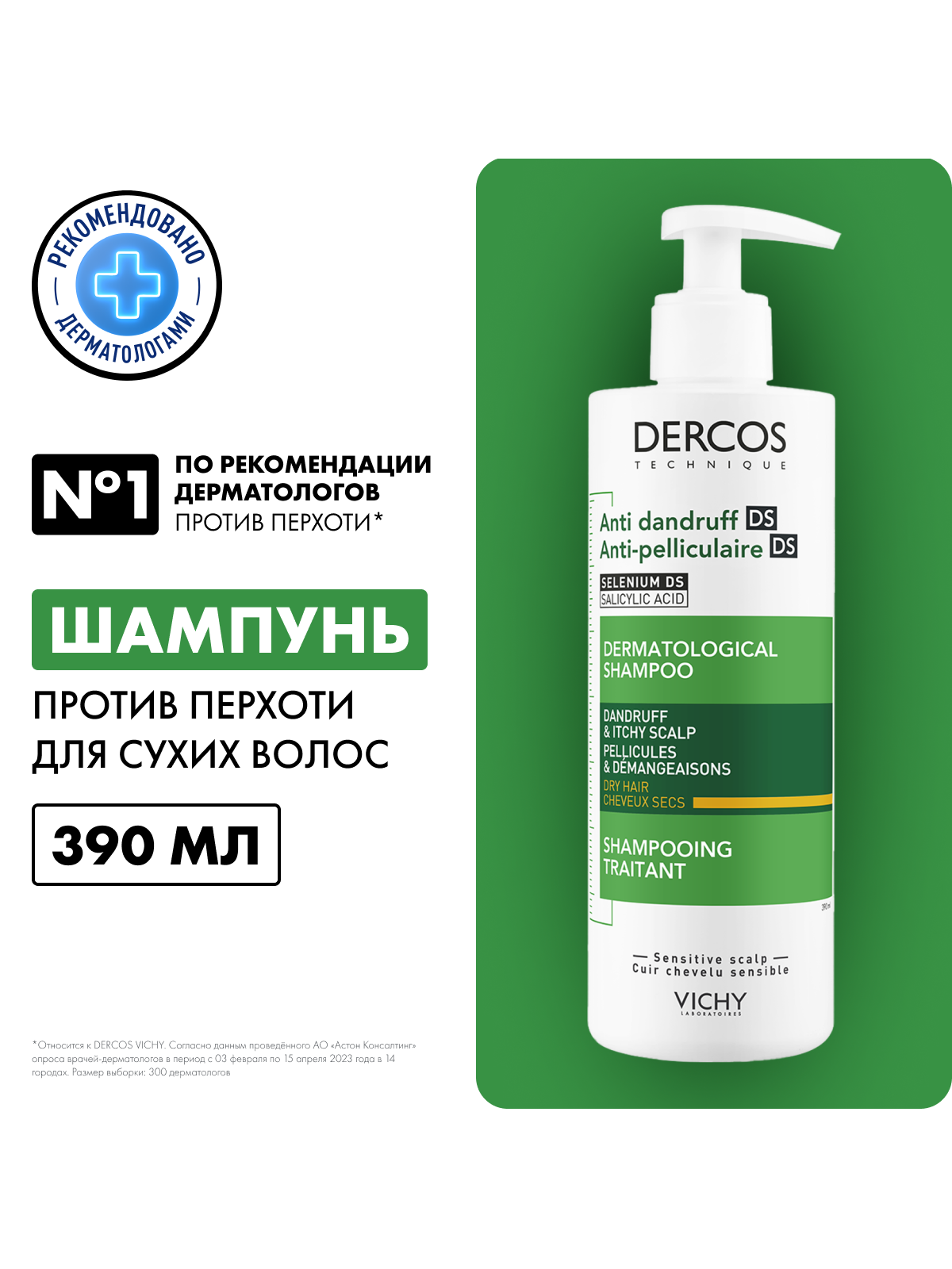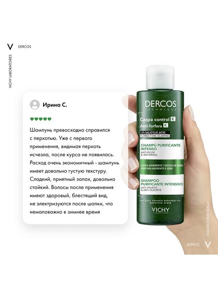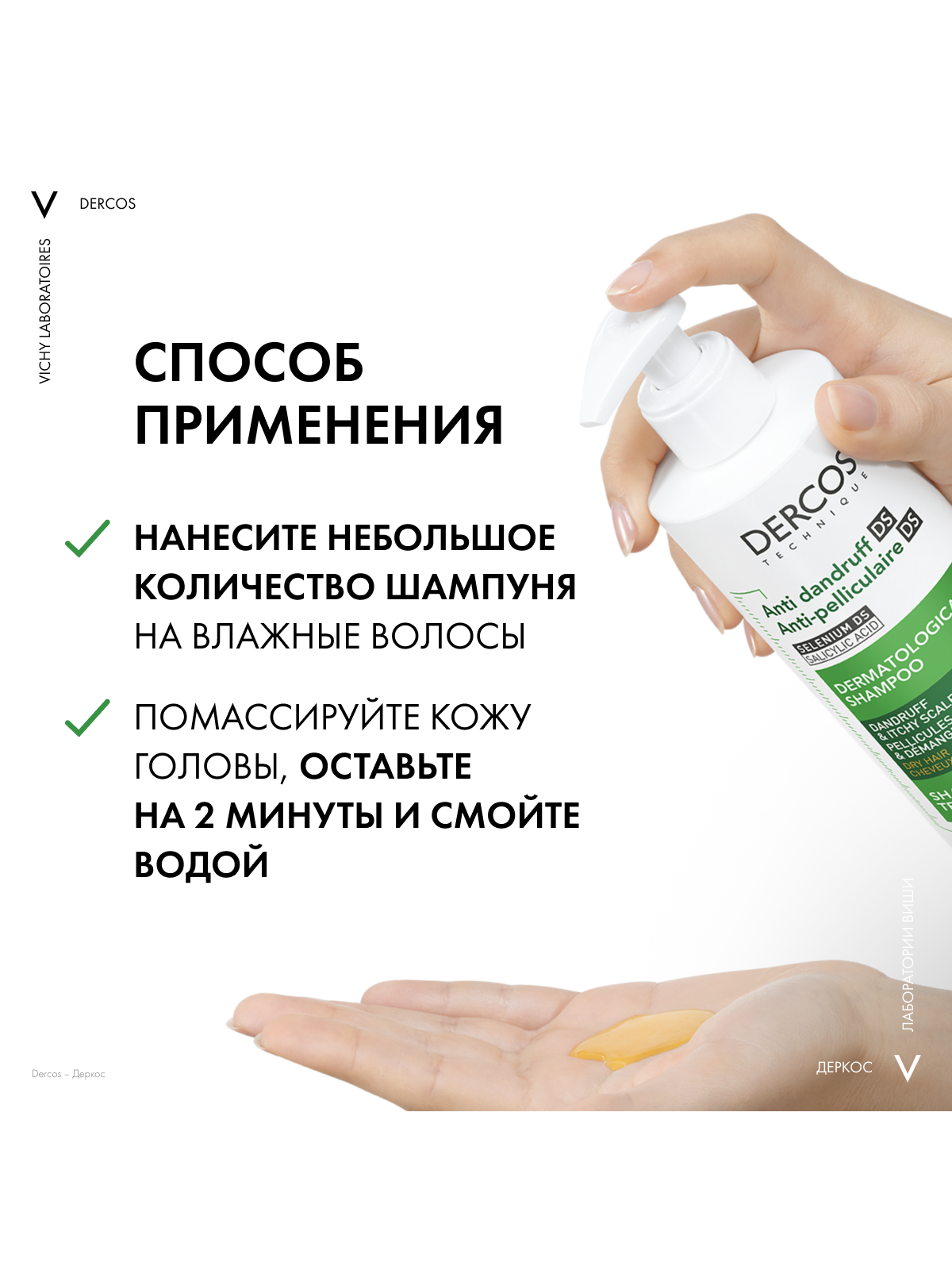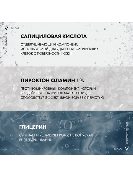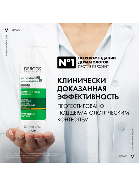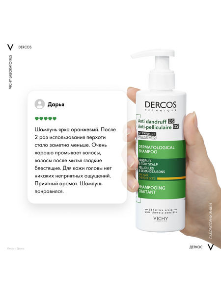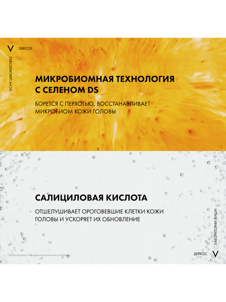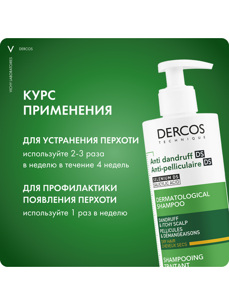 - Впервые Лаборатории VICHY DERCOS выявили, что причина появления перхоти – не только рост бактерии Malassezia, но и дисбаланс всего микробиома кожи головы (совокупности микроорганизмов, в норме присутствующих на коже). Этот дисбаланс усиливается под воздействием агрессивной внешней среды, экологии, стресса, усталости. Технология с Селеном DS – самым эффективным ингредиентом против перхоти – предотвращает зуд, восстанавливает микробиомный баланс и барьерные функции кожи головы. Способ применения и нанесения: Нанесите небольшое количество шампуня на влажные волосы, помассируйте, оставьте на 2 минуты и смойте водой. Курс применения для устранения перхоти: 2-3 раза в неделю в течение 4 недель. Для профилактики появления перхоти используйте 1 раз в неделю.