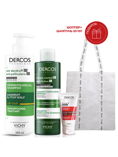 Vichy Набор Деркос VICHY DERCOS Интенсивный шампунь-уход против перхоти для сухих волос, 390 мл + VICHY DERCOS Глубоко очищающий шампунь-пилинг против перхоти, 250 мл шоппер и миниатюра (подарок).