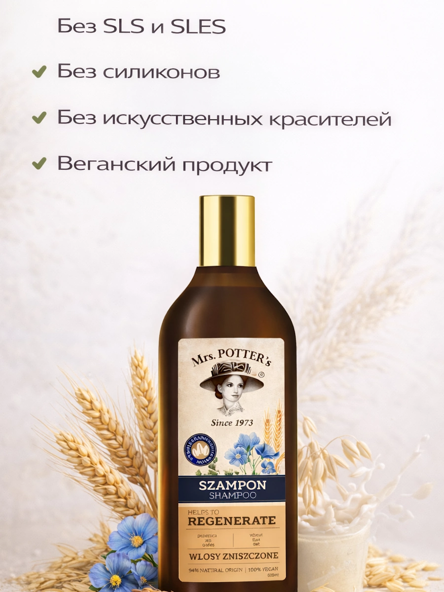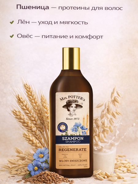 Шампунь тройная сила зерен и злаков. Шампунь для поврежденных волос, требующих регенерации. Тройная сила природы исходящая из зерен и злаков. Компоненты растительного происхождения: протеины пшеницы, экстракт льна, овсяное молочко. 94% компонентов растительного происхождения. Веганский продукт. Не содержит SLS и SLES. Формула без силикона. Не содержит искусственных красителей. Указания по применению: Нанести на влажные волосы, вспенить и тщательно прополоскать.