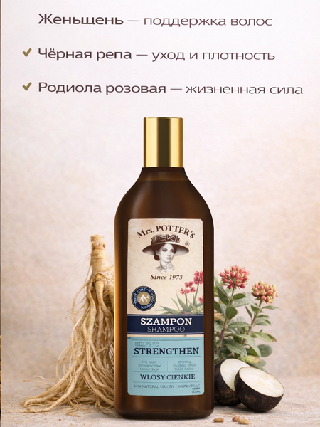 Шампунь Тройная сила корней 390 мл. Шампунь для тонких волос, требующих укрепления. Тройная сила природы исходящая из корней. Компоненты растительного происхождения: экстракт жен-шеня, экстракт черной репы, экстракт радиолы розовой. 94% компонентов растительного происхождения. Веганский продукт. Не содержит SLS и SLES. Формула без силикона. Не содержит искусственных красителей. Указания по применению: Нанести на влажные волосы, вспенить и тщательно прополоскать.