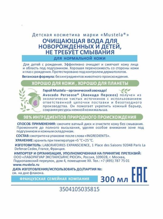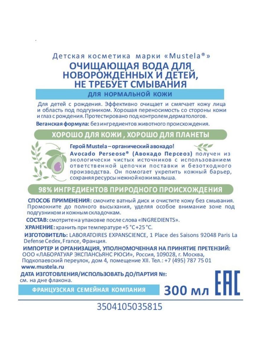 Mustela Очищающая вода для новорождённых и детей, не требует смывания, 300мл