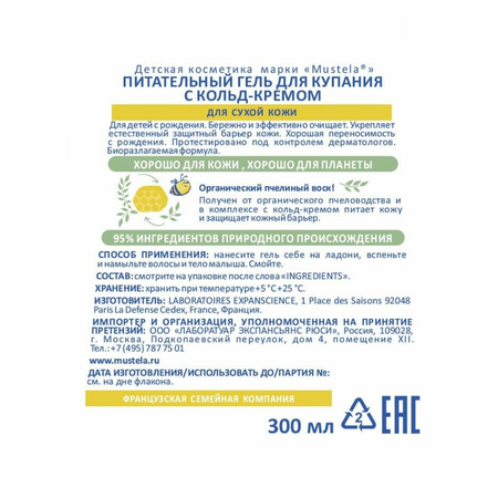 Mustela Питательный гель для купания с колд-кремом, 300мл