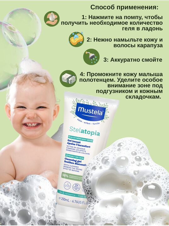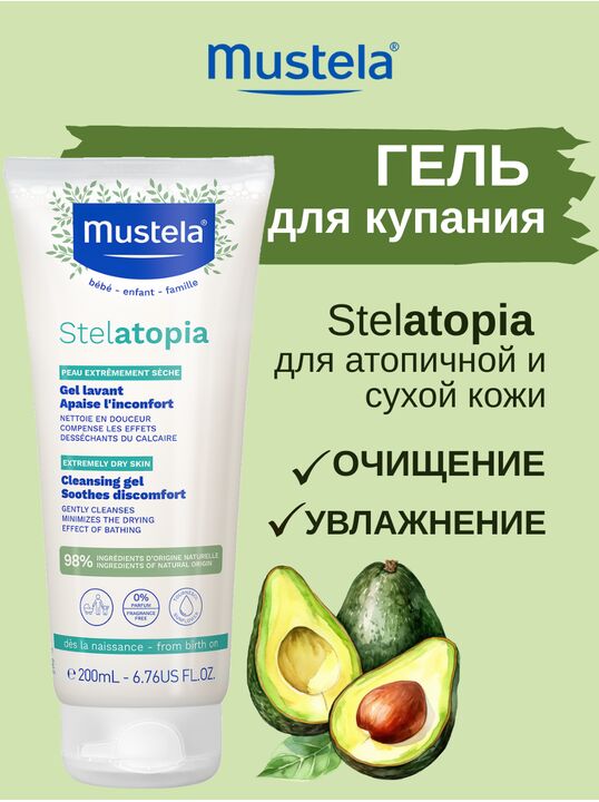 БрендMustela Возрастные ограничения0+ ГаммаStelatopia НазначениеСмягчение и увлажнение, Атопический дерматит (обострение), Атопический дерматит (ремиссия) Область примененияТело Состояние кожиАтопичная, Очень сухая Тип продуктаГель для купания ПотребностьУвлажнение, Успокоение