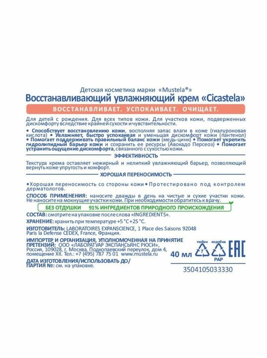 - Способствует восстановлению кожи, восполняя запас влаги в коже (гиалуроновая кислота).