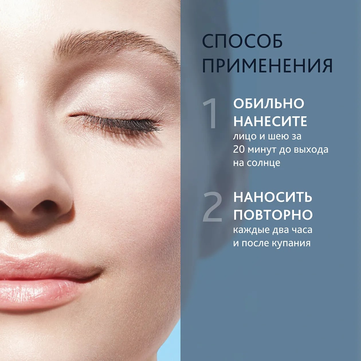 Способ применения и нанесения: Наносить крем следует за 20 минут до выхода на солнце и обновлять каждые 2 часа и каждый раз после купания.