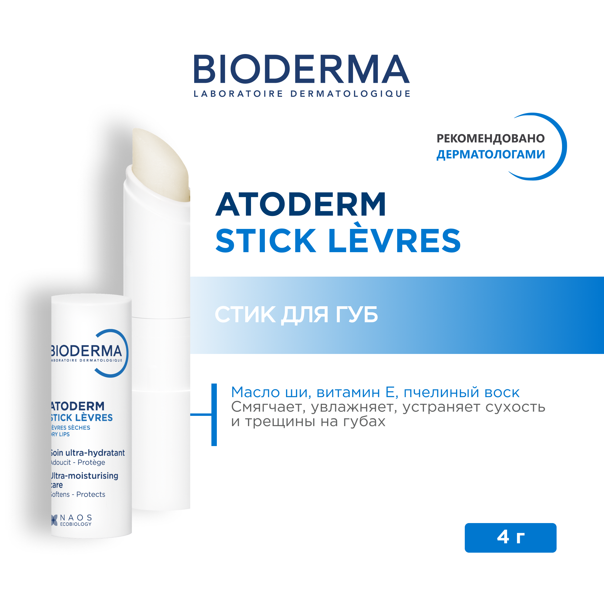 Atoderm Стик для губ питательный, увлажняющий, 4 гр