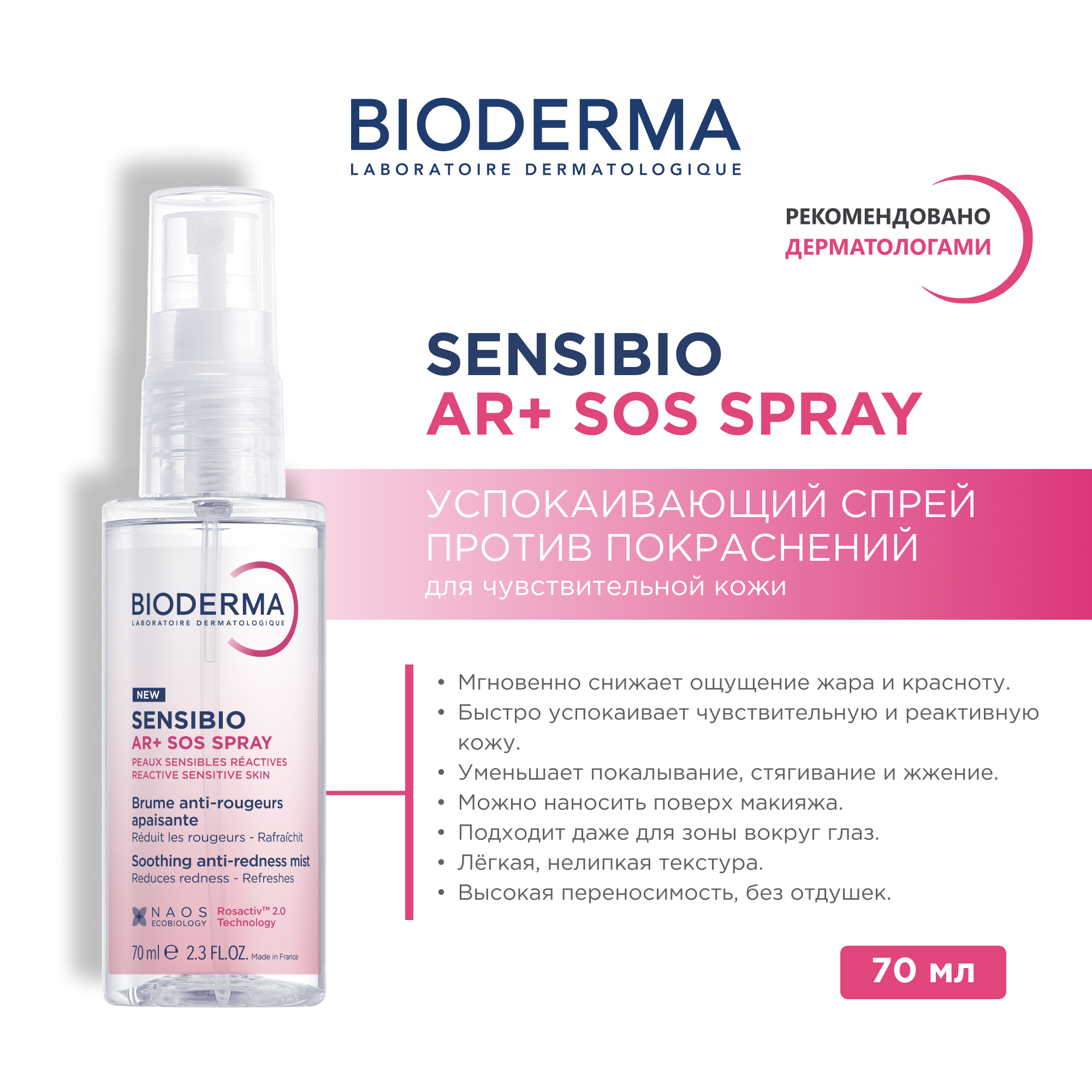 Sensibio AR+ SOS Spray – спрей моментального действия для куперозной и склонной к покраснениям кожи. Успокаивает кожу за 30 секунд, снижает интенсивность и частоту покраснений. Уникальная технология RED.SENS воздействует на причины сосудистой реактивности, укрепляет стенки капилляров и предотвращает развитие стойкого покраснения. Подходит для лица и тела, можно наносить поверх макияжа. Преимущества: Быстрое снятие покраснения и жжения Подходит при куперозе и розацеа Не требует растирания — удобен в дороге или на работе Лёгкая водная текстура без липкости Без отдушек, спирта и парабенов Для взрослых и подростков с чувствительной кожей Способ применения: Распылите на кожу с расстояния 20 см. При необходимости можно распределить кончиками пальцев. Используйте по мере необходимости в течение дня. Форма выпуска: флакон-спрей 70 мл Производство: Bioderma (Франция)