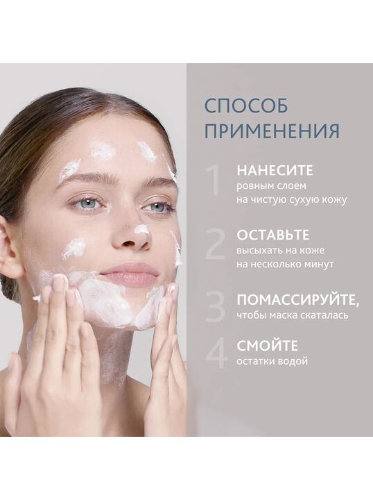 Способ применения и нанесения: Наносить ровным слоем на чистую сухую кожу лица, шеи и зоны декольте. Можно использовать вокруг глаз. Оставить на несколько минут, помассировать, чтобы маска скаталась. Остатки смыть водой. Идеально сочетать с кремом дезинкрустантом.