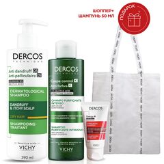 Vichy Набор Деркос VICHY DERCOS Интенсивный шампунь-уход против перхоти для сухих волос, 390 мл + VICHY DERCOS Глубоко очищающий шампунь-пилинг против перхоти, 250 мл шоппер и миниатюра (подарок). Впервые Лаборатории VICHY DERCOS выявили, что причина появления перхоти – не только рост...