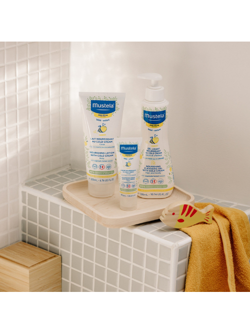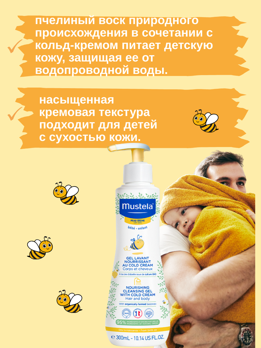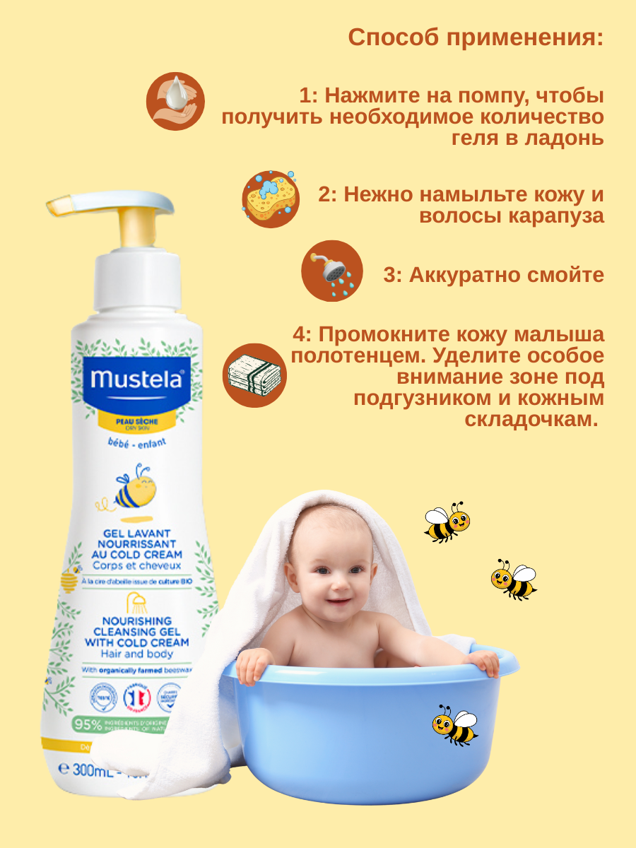 Нанесите гель себе на ладони, вспеньте и намыльте волосы и тело малыша. Смойте.