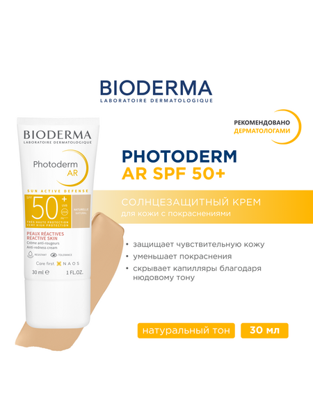 Bioderma Photoderm AR SPF 50+ Tinted cream (Биодерма Фотодерм AR Крем тонирующий SPF 50+) для чувствительной кожи с покраснениями и розацеа.Солнцезащитный крем Bioderma Photoderm AR с фактором защиты от UVA / UVB излучений 50+. Защищает клетки от повреждения и предотвращает процессы преждевременного старения. Идеально подходит чувствительной коже, легко распределяется и не оставляет жирной пленки. Хорошо переносится кожей, не раздражает. Универсальный легкий тон маскирует покраснения и выравнивает цвет лица.Активные компоненты: Патент Rosactiv на биологическом уровне успокаивает кожу и уменьшает покраснения; Патент BioProtectionзащищает клетки кожи от воздействия ультрафиолета на биологическом уровне.фотостабильный.влагоустойчивый.без отдушек.некомедогенно.