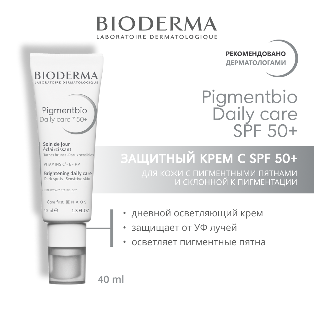 Солнцезащитный уход – важный этап в уходе за кожей с гиперпигментацией. Bioderma Pigmentbio Daily care SPF 50+ прекрасное сбалансированное средство дневного ухода с осветляющим, защитным, увлажняющим эффектами, благодаря чему корректирует уже имеющиеся пигментные пятна, предотвращает проявление новых и ухаживает за кожей. Биодерма Пигментбио Дневной крем SPF 50+ обладает перламутровой текстурой, идеальной для нанесения макияжа. Клинические испытания, проводимые в течение 3 месяцев на 22 добровольцах (в возрасте от 22 до 40 лет с нормальной (50 %), комбинированной (41 %) или жирной (9%) кожей, фототипом III-IV и пигментными пятнами на лице) показали, что 96% добровольцев отметили уменьшение пигментных пятен и 91% указали на выравнивание цвета лица. Средство прошло дерматологический контроль.