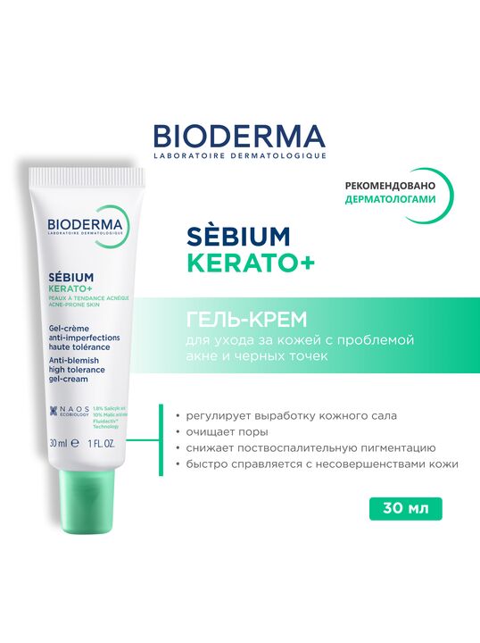 Sébium Kerato+ Gel-crème – инновационное решение проблемы акне для подростков и взрослых. Прекрасно сбалансированная формула гель-крема, сочетающая высокую эффективность и оптимальную переносимость, содержит безопасную концентрацию AHA-кислот, проявляющих активность при естественном pH кожи, что повышает переносимость средства. Биодерма Себиум Гель-крем Керато+ быстро справляется с несовершенствами кожи, очищает поры, снижает риск появления поствоспалительной пигментации и способствует обновлению кожи. Гель-крем имеет лёгкую текстуру с приятным ароматом, подходит в качестве основы под макияж. Клинические исследования с участием 30 добровольцев (при лёгкой и средней степени акне) показали эффективность средства уже через 2 дня применения - 19% воспалительных элементов - 20% следов постакне +23% однородность кожи Протестировано под дерматологическим контролем.
