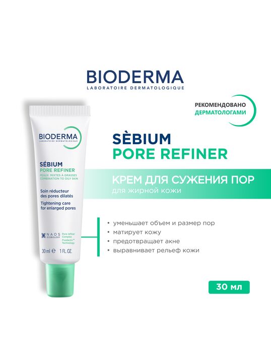 Средство Bioderma Sebium Pore Refiner разработано специально для борьбы с деформацией и расширением пор. В его состав входит запатентованный комплекс Флюидактив, который нормализует состав себума, снижает активность сальных желез и препятствует закупориванию их выводных протоков.