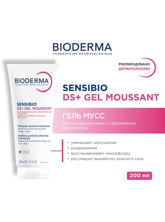 Bioderma Sensibio DS+ Gel moussant - успокаивающий оздоравливающий гель для чувствительной кожи лица и тела. Биодерма Сенсибио DS+ Гель бережно удаляет загрязнения, уменьшает шелушение и раздражение кожи. Формула без щёлочи и отдушек восстанавливает естественный баланс микрофлоры и снижает выработку кожного сала, что благотворно влияет на кожу с себорейным дерматитом.
