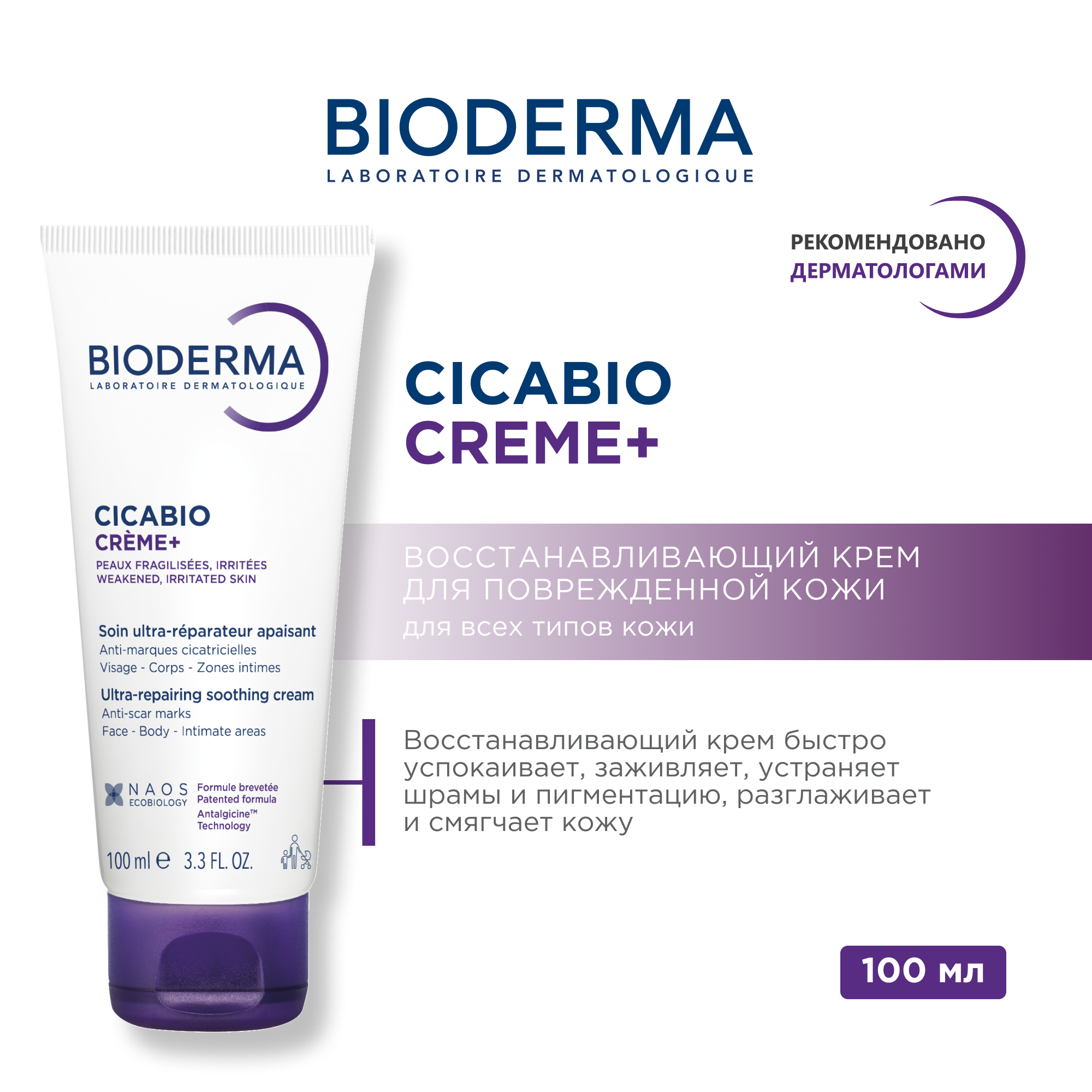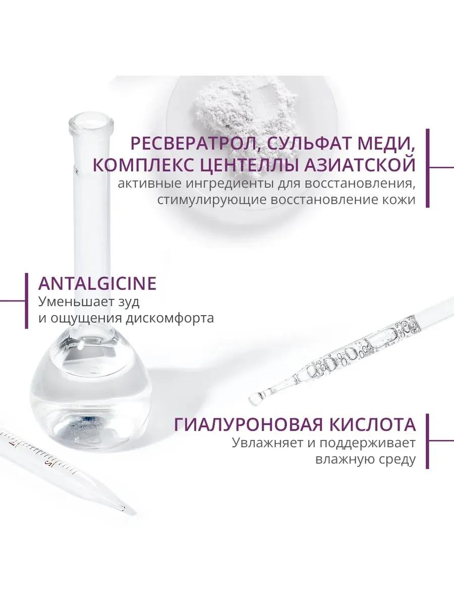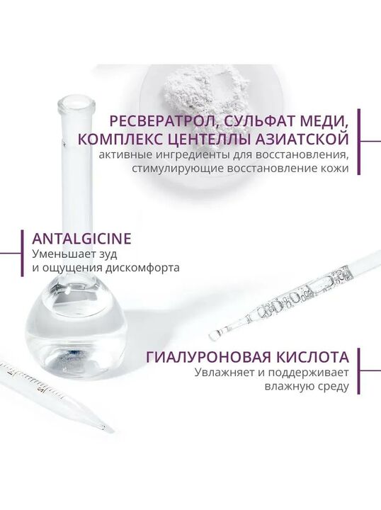 Крем действует на каждой стадии восстановления эпидермиса, способствуя быстрому восстановлению кожи. Текстура «дышащей повязки» и антибактериальный комплекс защищает поврежденную поверхность, одновременно крем блокирует пролиферацию бактерий. Комплекс Анталгицин мгновенно устраняет ощущение дискомфорта и зуд. Сочетание ресвератроля, гиалуроновой к-ты, увлажняющий компонентов и меди способствует полноценному восстановлению и увлажнению кожи.
