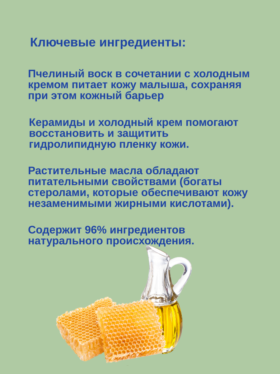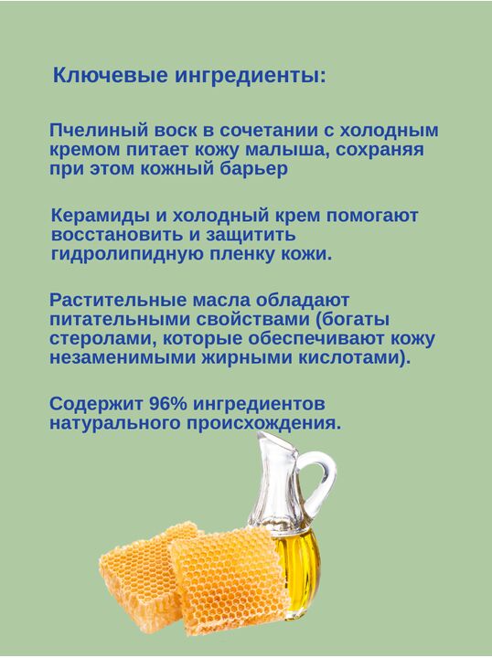 Защитный комплекс состоит из холодного крема и керамидов. Формула также обогащена авокадо Perseose. Это запатентованный компонент натурального происхождения. Крем усиливает защитный гидролипидный уровень от негативного действия внешней среды. Средство питает кожу на глубоких уровнях, поэтому сохраняет ее естественные защитные функции и защищает малыша от дискомфортных ощущений.