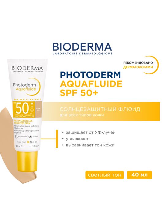 Cолнцезащитный аквафлюид Биодерма Фотодерм PHOTODERM AQUAFLUIDE LIGHT SPF50+ светлого оттенка с очень высокой степенью защиты от солнца (с Тональным Эффектом). / Благодаря патентованному комплексу SUN ACTIVE DEFENSE обеспечивается высокотехнологичная защита от солнца с усиленной защитой от УФА излучения. Это сочетание УФ-фильтров и запатентованной биологической защиты, которая повышает способность самозащиты кожи, чтобы помочь длительно сохранять здоровье кожи под воздействием солнца. / Аквафлюид Photoderm со светлым оттенком обеспечивает оптимальную защиту от УФ-излучения в сочетании с внутренней биологической защитой. Он создает ощущение матовой кожи и выравнивает цвет лица. / Аквафлюид BIODERMA Photoderm со светлым оттенком SPF 50+, 40 мл – очень высокая степень защиты от солнца, легкий, как вода, обеспечивает матовое покрытие. / Возрастная группа: 16+ / Особенности/действие продукта: Кожа оптимально защищена от УФ-излучения, при этом защищены и клетки. Кожа матовая, ее цвет выровнен. Подходит: Женщинам, мужчинам, беременным/кормящим матерям. / Преимущества продукта: Особо легкая консистенция, подходит для светлой кожи. Не вызывает ощущения жирности кожи на протяжении всего дня. Не способствует закупорке пор, фотостабильный и мультирезистентный (к воде, высокой температуре, высокой влажности). Очень хорошая переносимость на коже и вокруг глаз в обычных условиях применения.