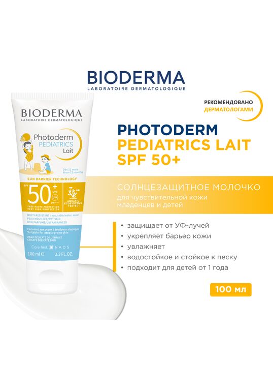Bioderma Photoderm Pediatrics Lait SPF50+ — это солнцезащитное средство широкого спектра действия с очень высокой степенью защиты для нежной детской кожи .Технология Sun Barrier сочетает в себе УФ-фильтры и витамин Е, антиоксидант, естественным образом присутствующий в коже, с маслом абрикосовых косточек, богатым биомиметическими липидами. Он обеспечивает двойную экобиологическую защиту, адаптированную к нежной коже детей:- Очень высокая защита широкого спектра UVA/UVB.- Защита и укрепление кожного барьера, что также предотвращает долгосрочное повреждение.Эта короткая формула основана на четырех высокоэффективных, безопасных и экологически чистых фильтрах.Его легкая, быстро впитывающаяся текстура делает кожу мягкой и комфортной, обеспечивая невидимый и нелипкий финиш.Протестировано под педиатрическим, дерматологическим и офтальмологическим контролем. Подходит для кожи с атопической тенденцией.Очень хорошая переносимость.Фотографии таблицы. Мультистойкий (вода, песок), подходит для влажной кожи.Непарфюмированный.