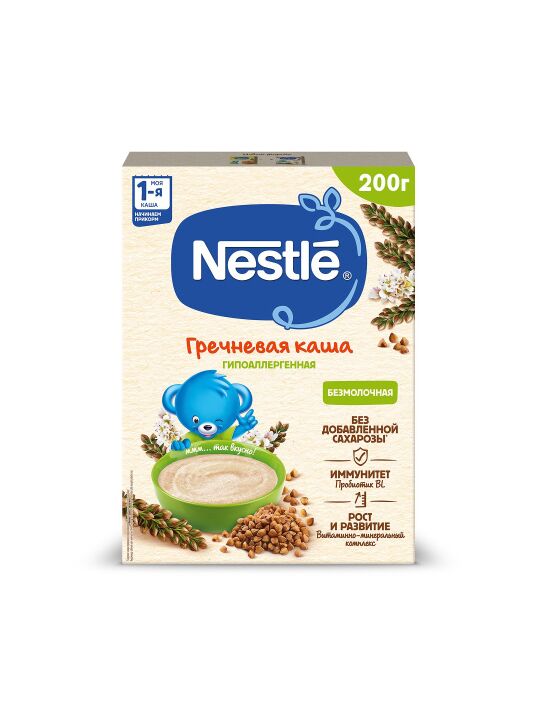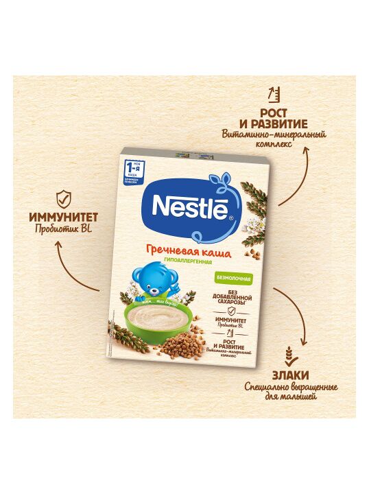 Безмолочная гречневая каша Nestlé приготовлена с использованием особой технологии бережного расщепления злаков CHE. Благодаря этому в продукте появляется естественный сладкий вкус, каша лучше усваивается и имеет повышенную пищевую ценность. Гипоаллергенная, приготовлена из безглютеновой крупы.