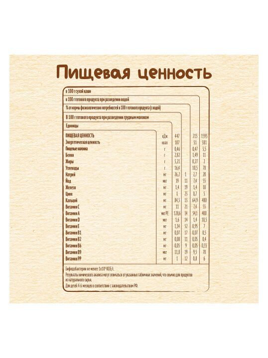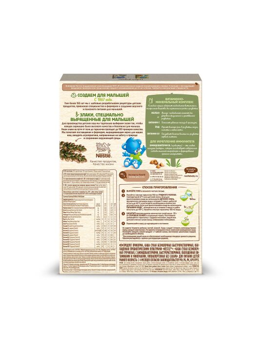 Каша содержит комплекс витаминов и минеральных веществ iRON+ для здорового роста и развития. При непереносимости лактозы и/или белков коровьего молока кашу необходимо разводить либо водой либо молочной смесью, которую вы используете для вскармливания вашего ребенка.