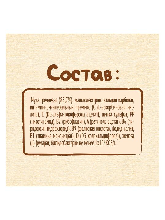 Состав: мука гречневая, мальтодекстрин, витамины и минеральные вещества, бифидобактерии не менее 1х10^6 КОЕ/г. Продукт может содержать глютен и молоко. Содержит 9 витаминов и 5 минеральных веществ.