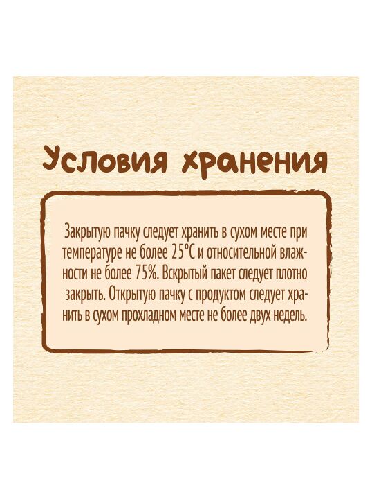 Условия хранения: закрытую пачку хранить в сухом месте при температуре не более 25°С и относительной влажности воздуха не более 75%. Вскрытый пакет следует плотно закрыть. Открытую пачку с продуктом следует хранить в сухом прохладном месте не более двух недель.
