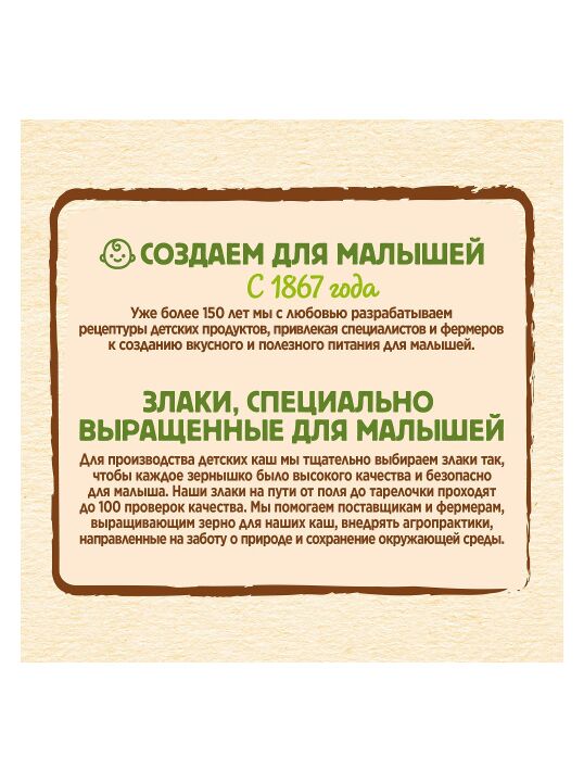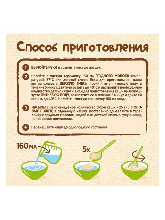 Меры предосторожности: Не варите! Кормите ребенка чистой ложкой. Кашу следует готовить непосредственно перед каждым кормлением. Не храните оставшуюся после кормления разведенную кашу. Начинайте вводить новый продукт с 1 чайной ложки, постепенно увеличивая порцию до необходимого объема.