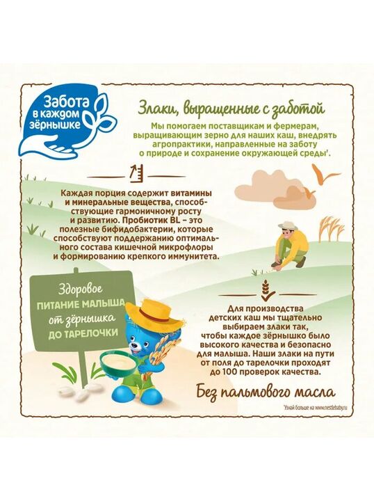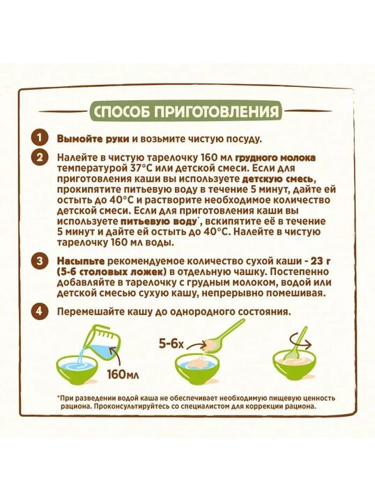Меры предосторожности: Не варите! Кормите ребенка чистой ложкой. Кашу следует готовить непосредственно перед каждым кормлением. Не храните оставшуюся после кормления разведенную кашу. Начинайте вводить новый продукт с 1 чайной ложки, постепенно увеличивая порцию до необходимого объема.