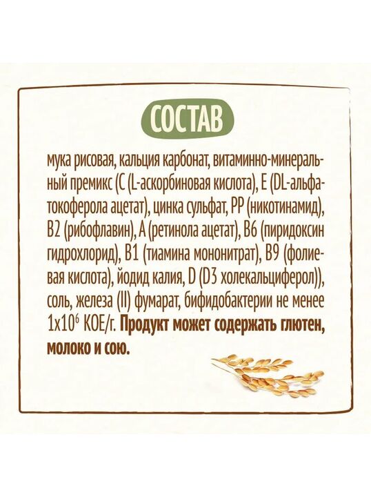 Состав : Мука рисовая, кальция карбонат, витаминно-минеральный премикс (С (L-аскорбиновая кислота), E (DL-альфа-токоферола ацетат), цинка сульфат, РР (никотинамид), В2 (рибофлавин), A (ретинола ацетат), В6 (пиридоксин гидрохлорид), В1 (тиамина мононитрат), B9 (фолиевая кислота), йодид калия, D (D3 холекальциферол)), соль, железа (II) фумарат, бифидобактерии не менее 1х106 КОЕ/г. Продукт может содержать глютен, молоко и сою.