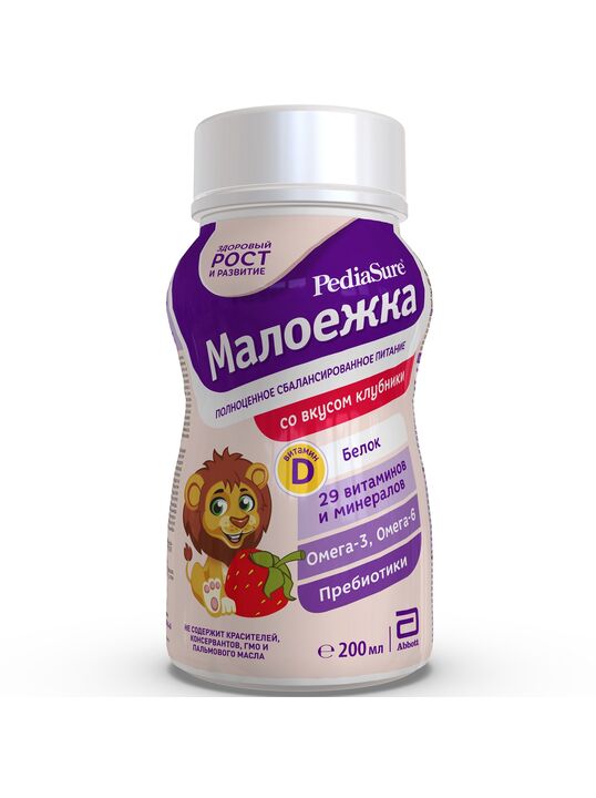 PediaSure Малоежка со вкусом клубники - это вкусный питательный напиток, который дополнит несбалансированную еду питательными веществами, чтобы ребёнок получал всё самое необходимое для здорового роста, развития и укрепления иммунитета*. Предназначен для питания детей от 1 года до 10 лет, подходит для ежедневного употребления.