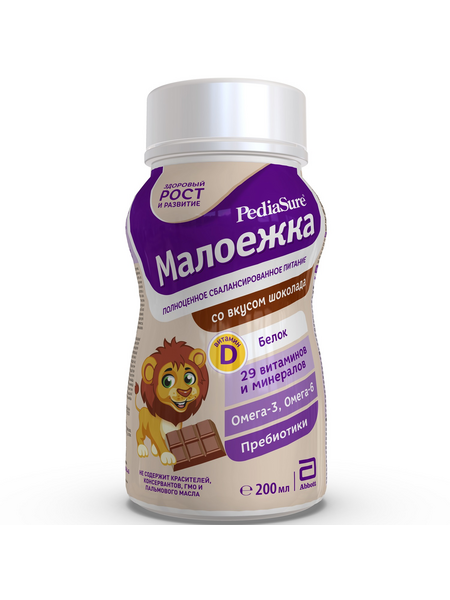 PediaSure Малоежка со вкусом шоколада - это вкусный питательный напиток, который дополнит несбалансированную еду питательными веществами, чтобы ребёнок получал всё самое необходимое для здорового роста, развития и укрепления иммунитета*. Предназначен для питания детей от 1 года до 10 лет, подходит для ежедневного употребления.