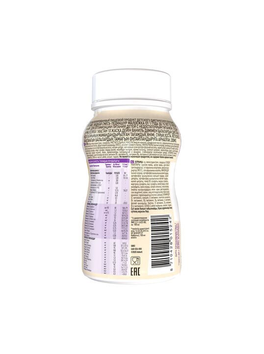 Вода, мальтодекстрин, сахароза, РАСТИТЕЛЬНЫЕ МАСЛА (масло канола, кукурузное масло, среднецепочечные триглицериды), концентрат молочного белка, фруктоолигосахариды (ФОС), изолят соевого белка, МИНЕРАЛЫ (калия хлорид, калиевые соли ортофосфорной кислоты, кальциевые соли ортофосфорной кислоты, натрия цитрат, магниевые соли ортофосфорной кислоты, калия цитрат, железа (II) сульфат, цинка сульфат, марганца сульфат, меди сульфат, йодид калия, молибдат натрия, хрома хлорид, селенат натрия), эмульгаторы (моно- и диглицериды жирных кислот, соевый лецитин), холин, ароматизаторы (натуральный и ванилин), стабилизатор (ксантановая камедь), ВИТАМИНЫ (витамин С , ниацин, витамин Е , пантотеновая кислота , витамин В1 , витамин В2 , витамин В6 , витамин А , фолиевая кислота, биотин , витамин К , витамин D3 , витамин В12 ), (DHA) из масла C.cohnii, инозит, таурин.