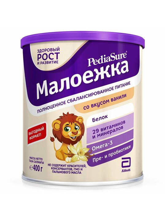 PediaSure Малоежка со вкусом ванили - это сухая смесь для приготовления вкусного питательного напитка, который дополнит несбалансированную еду питательными веществами, чтобы ребёнок получал всё самое необходимое для здорового роста, развития и укрепления иммунитета*. Предназначен для питания детей от 1 года до 10 лет, подходит для ежедневного употребления.