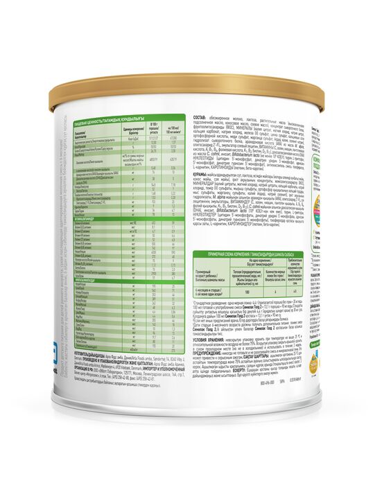 Обезжиренное молоко, лактоза, РАСТИТЕЛЬНЫЕ МАСЛА (высокоолеиновое подсолнечное масло, кокосовое масло, соевое масло), концентрат сывороточного белка, фруктоолигосахариды (ФОС), МИНЕРАЛЫ (калия цитрат, магния хлорид, натрия цитрат, кальция карбонат, натрия хлорид, железа (II) сульфат, цинка сульфат, кальциевые соли ортофосфорной кислоты, меди сульфат, марганца сульфат, йодид калия, селенит натрия), гидролизат сывороточного белка, арахидоновая кислота (АRA) из масла M.alpina, олигосахарид 2'-FL, эмульгатор соевый лецитин, ВИТАМИНЫ (витамин C, холин, ниацин, пантотеновая кислота, витамин А, витамин B1, витамин B6, фолиевая кислота, витамин К1, витамин B2, биотин, витамин D3, витамин В12), докозагексаеновая кислота (DHA) из масла C.cohnii, инозит, Bifidobacterium lactis (не менее 106 КОЕ/г), таурин, L-триптофан, НУКЛЕОТИДЫ (цитидин 5’-монофосфат, динатрия уридин 5’-монофосфат, аденозин 5’-монофосфат, динатрия гуанозин 5’-монофосфат), антиокислитель смесь токоферолов, L-карнитин, КАРОТИНОИДЫ (лютеин, бета-каротин).