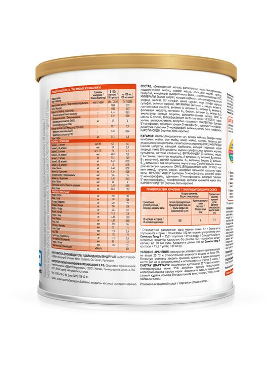 Обезжиренное молоко, растительные масла (высокоолеиновое подсолнечное масло, соевое масло, кокосовое масло), лактоза, сахароза, концентрат сывороточного белка, галактоолигосахариды (ГОС), МИНЕРАЛЫ (калия цитрат, кальция карбонат, кальция гидроксид, натрия хлорид, железа (II) сульфат, цинка сульфат, меди сульфат, марганца сульфат, селенат натрия), ВИТАМИНЫ (витамин C, ниацин, витамин Е, пантотеновая кислота, витамин А, витамин В1, витамин В6, витамин В2, фолиевая кислота, витамин К1, биотин, витамин D3, витамин В12), эмульгатор соевый лецитин, докозагексаеновая кислота (DHA) из масла C.cohnii, Bifidobacterium lactis (не менее 106 КОЕ/г), таурин, холин, антиокислитель аскорбил пальмитат, НУКЛЕОТИДЫ (цитидин 5’-монофосфат, динатрия уридин 5’-монофосфат, аденозин 5’-монофосфат, динатрия гуанозин 5’-монофосфат), антиокислитель смесь токоферолов, КАРОТИНОИДЫ (лютеин, бета-каротин).