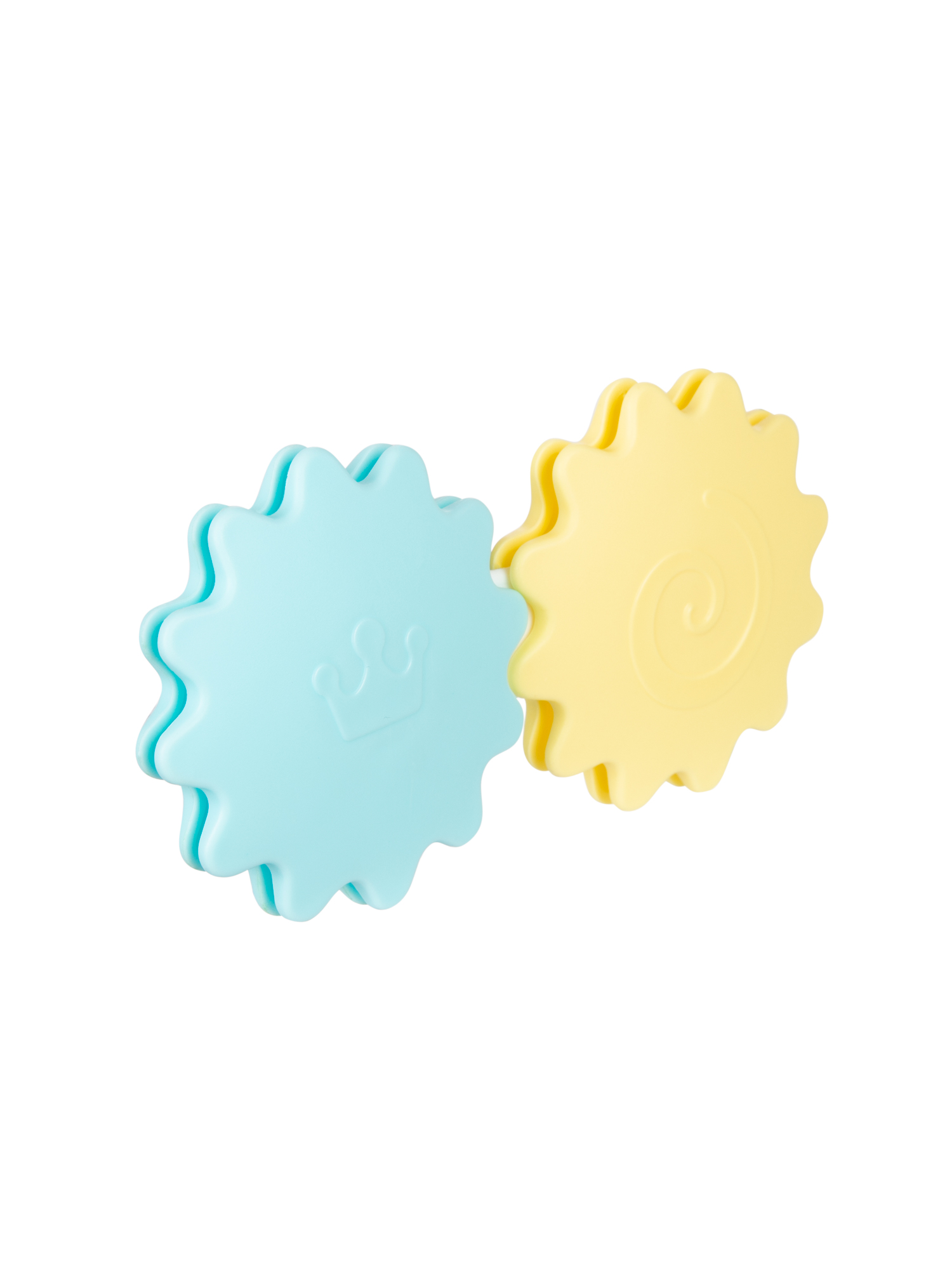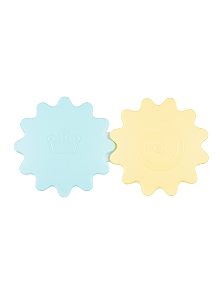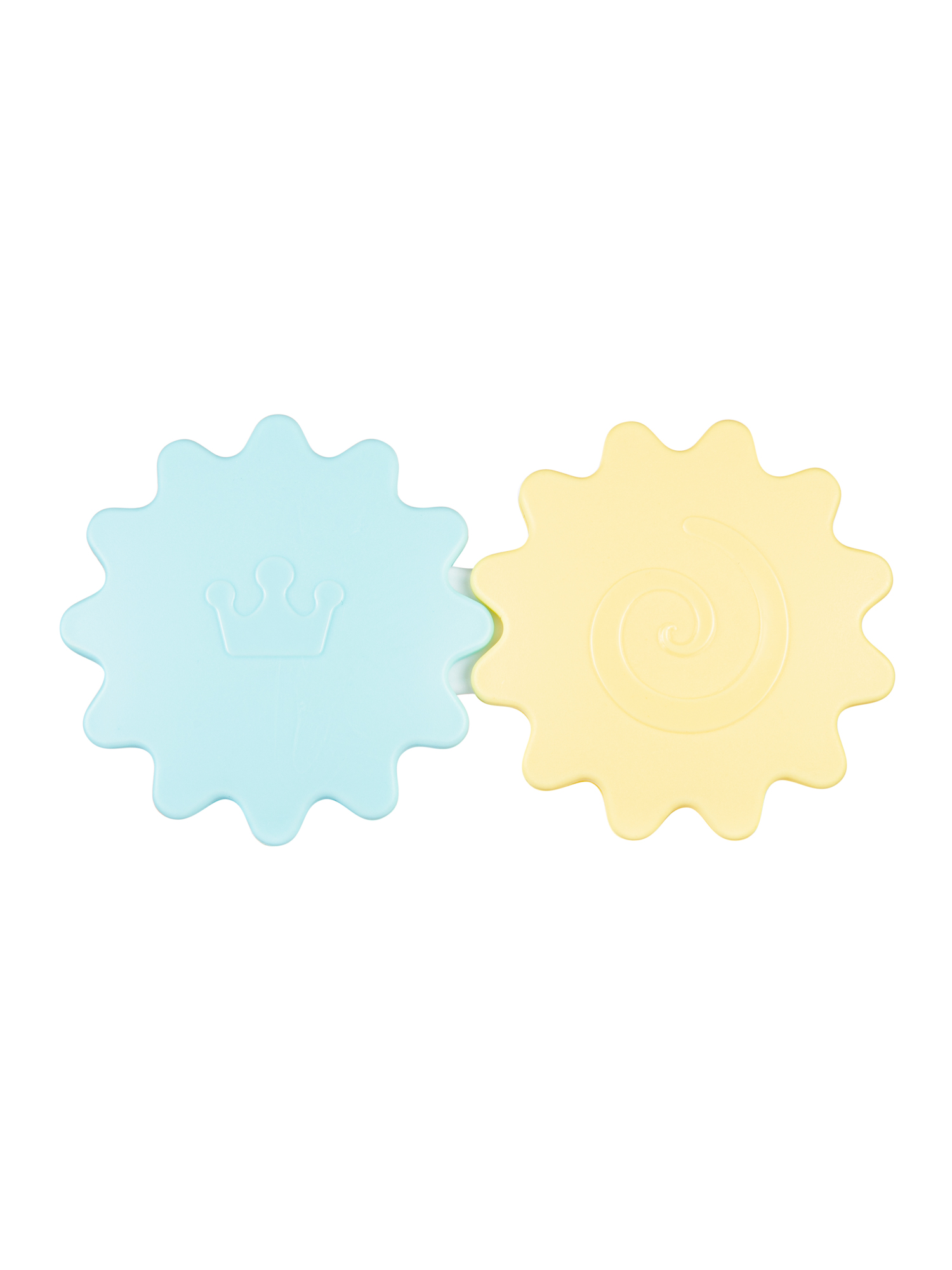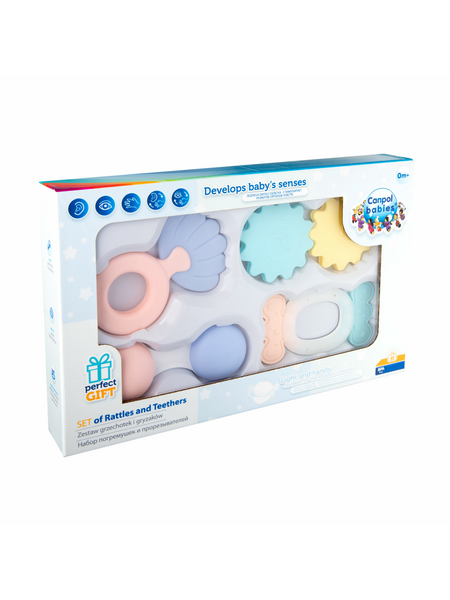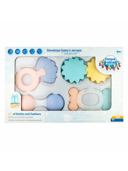 Игрушки оснащены гибкими прорезывателями, которые облегчают прорезывание зубов, а также имеют привлекающие внимание и стимулирующие игру вращающиеся элементы и погремушки.