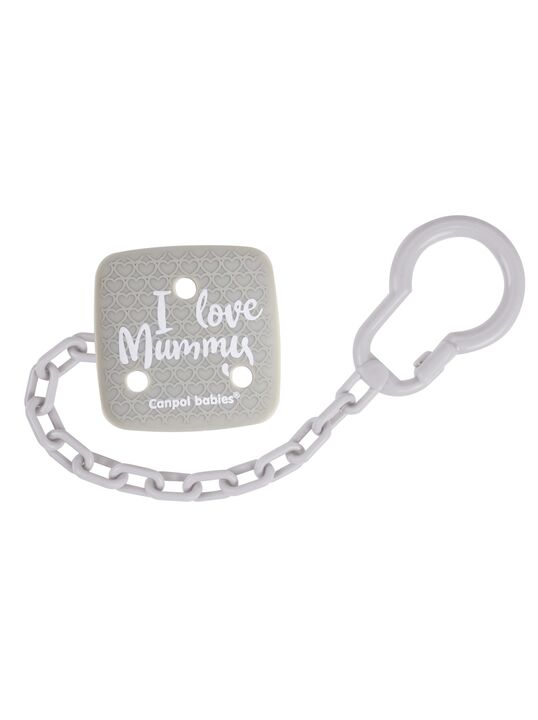 Описание: Держатель для пустышки I LOVE MUMMY защищает любимую пустышку вашего ребенка от падения, загрязнения или потери. Благодаря простой клипсе держатель для пустышки можно прикрепить к одежде ребенка одной рукой. Держатель для пустышки доступен в нескольких цветах.