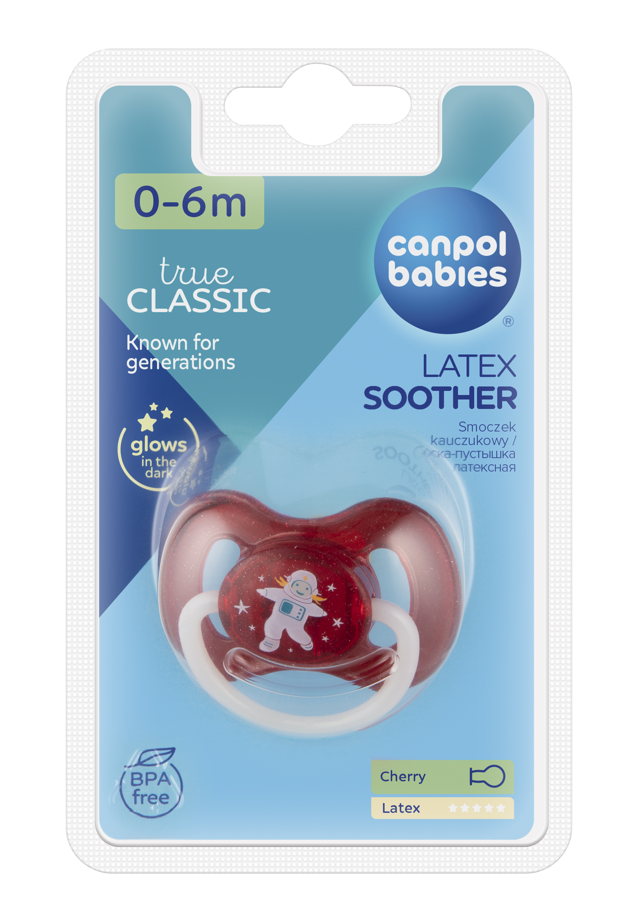 Пустышка SPACE изготовлена из высококачественного латекса. Соска в форме вишни. Специальный вентилируемый нагубник предотвращает натирание кожи ребенка вокруг рта. Не содержит BPA. Доступна в нескольких цветах. Подходит для детей от 0 до 6 месяцев.