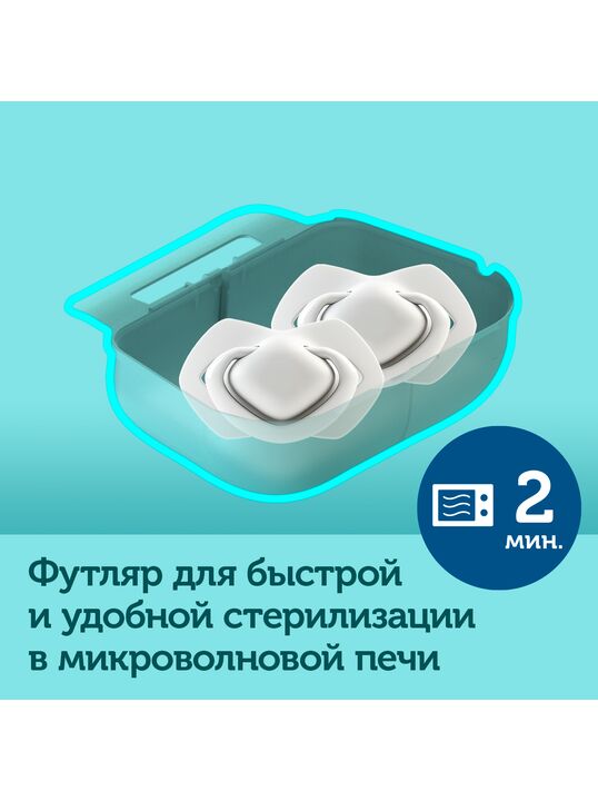 Пустышки легко содержать в чистоте благодаря современному футляру, который можно использовать не только для хранения, но и для быстрой и удобной дезинфекции в микроволновой печи.