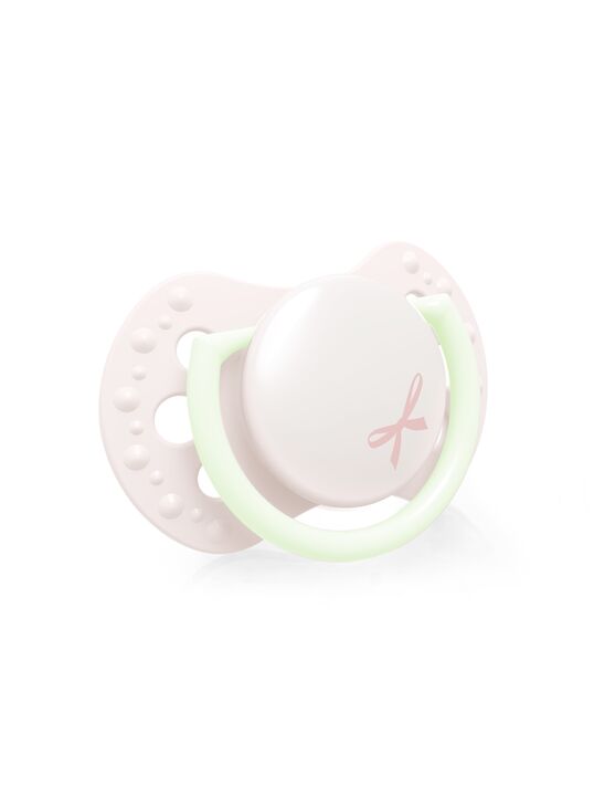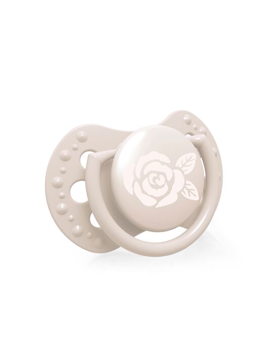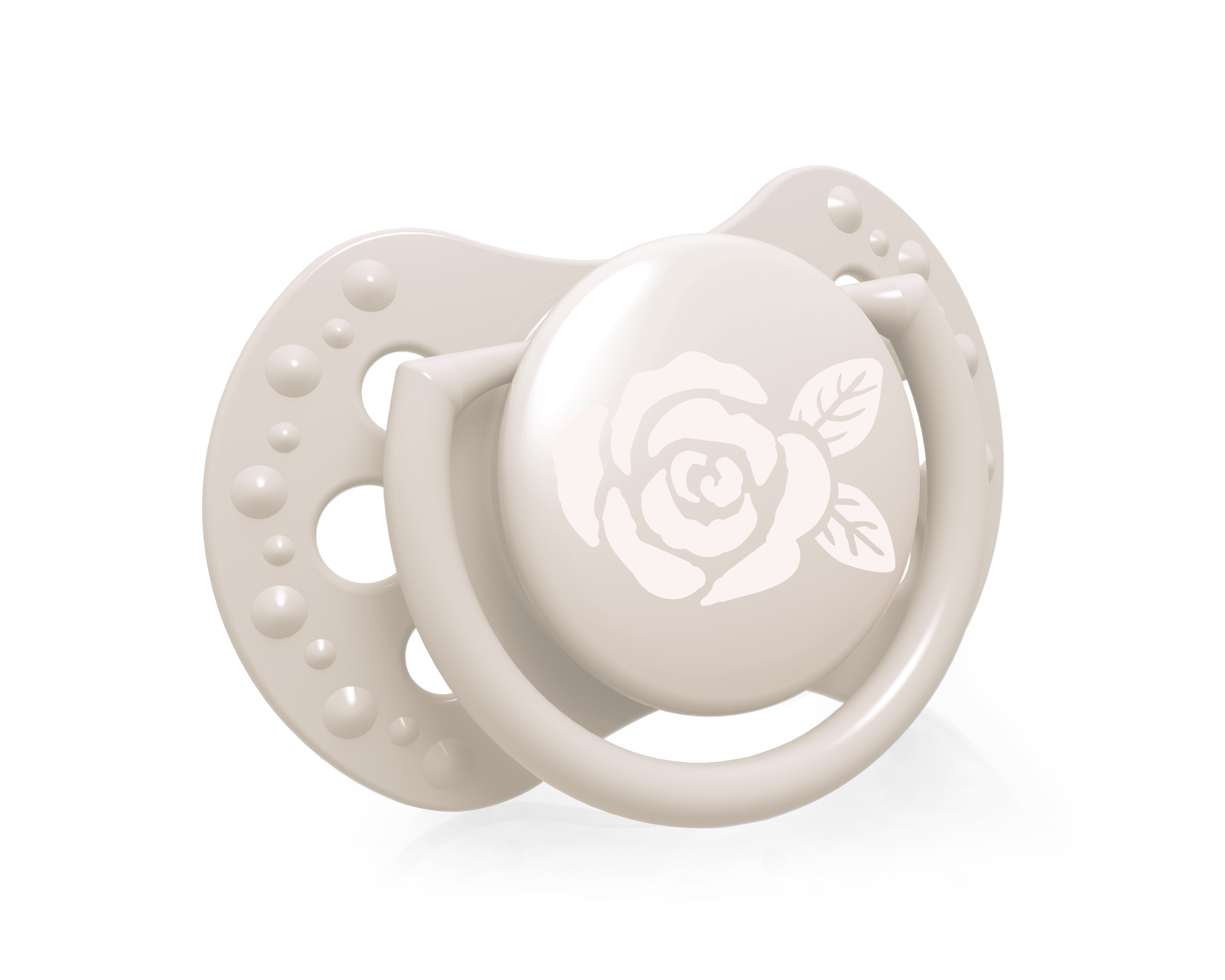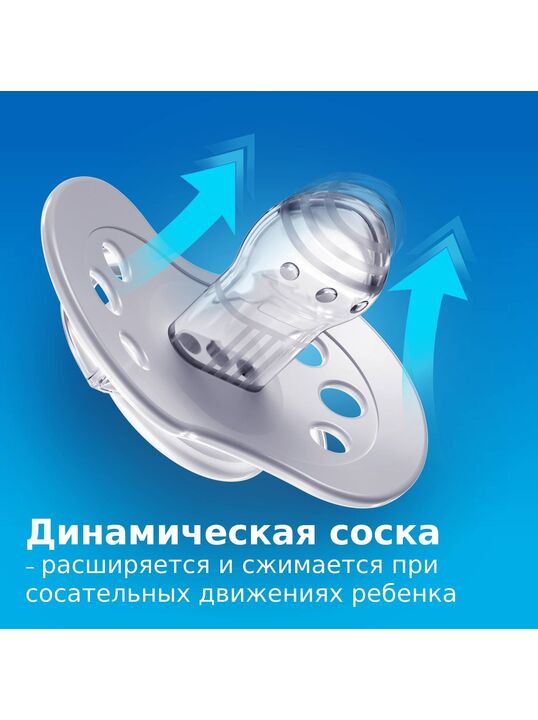 Соска пустышка изготовлена из гетерогенного силиконового слоя, который обеспечивает сжимание и расширение соски при сосательных движениях ребенка; симметричная форма соски основана на структуре соска.