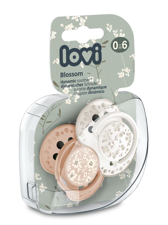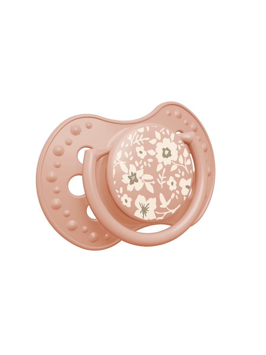 LOVI соска-пустышка силиконовая динамическая №2 BLOSSOM IVORY 0-6 месяцев для девочки изготовлена из гетерогенного силиконового слоя, который обеспечивает сжимание и расширение соски при сосательных движениях ребенка; симметричная форма соски основана на структуре соска.
